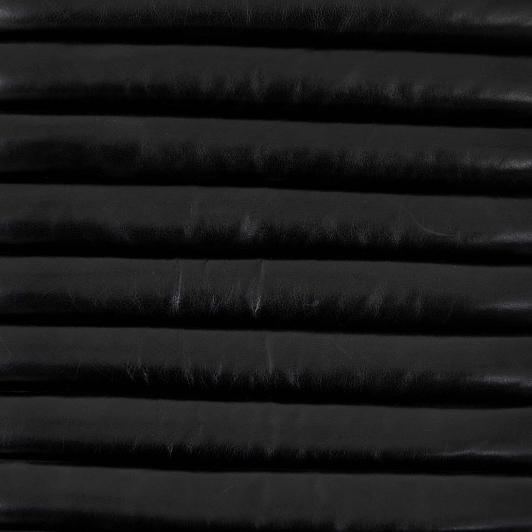 A dramatically shaped mid-century frame, modernized by channel tufting. Black top-grain leather contrasts with natural parawood, for a clean, cool look with vintage airs. A push recliner takes this forward-thinking lounger to the next level.