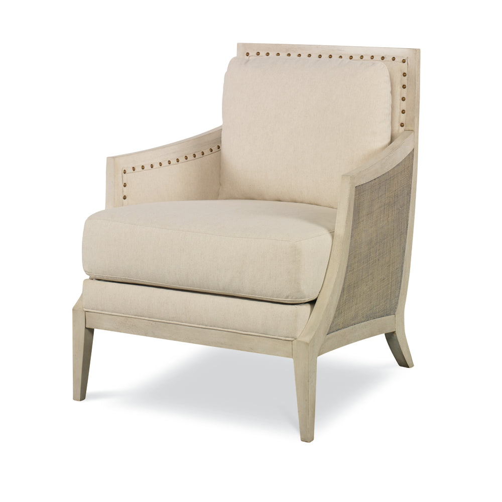 Hand crafted from Gmelina solids the Chesapeake Lounge Chair features a loose back and seat cushion upholstered in a Flax color upholstery. Inside panels are outlined with a spaced solid brass nailhead trim. The mix of raffia with light Grey finished wood creates a beautifully casual chair perfect for the corner of a bedroom or as an accent in the living room.