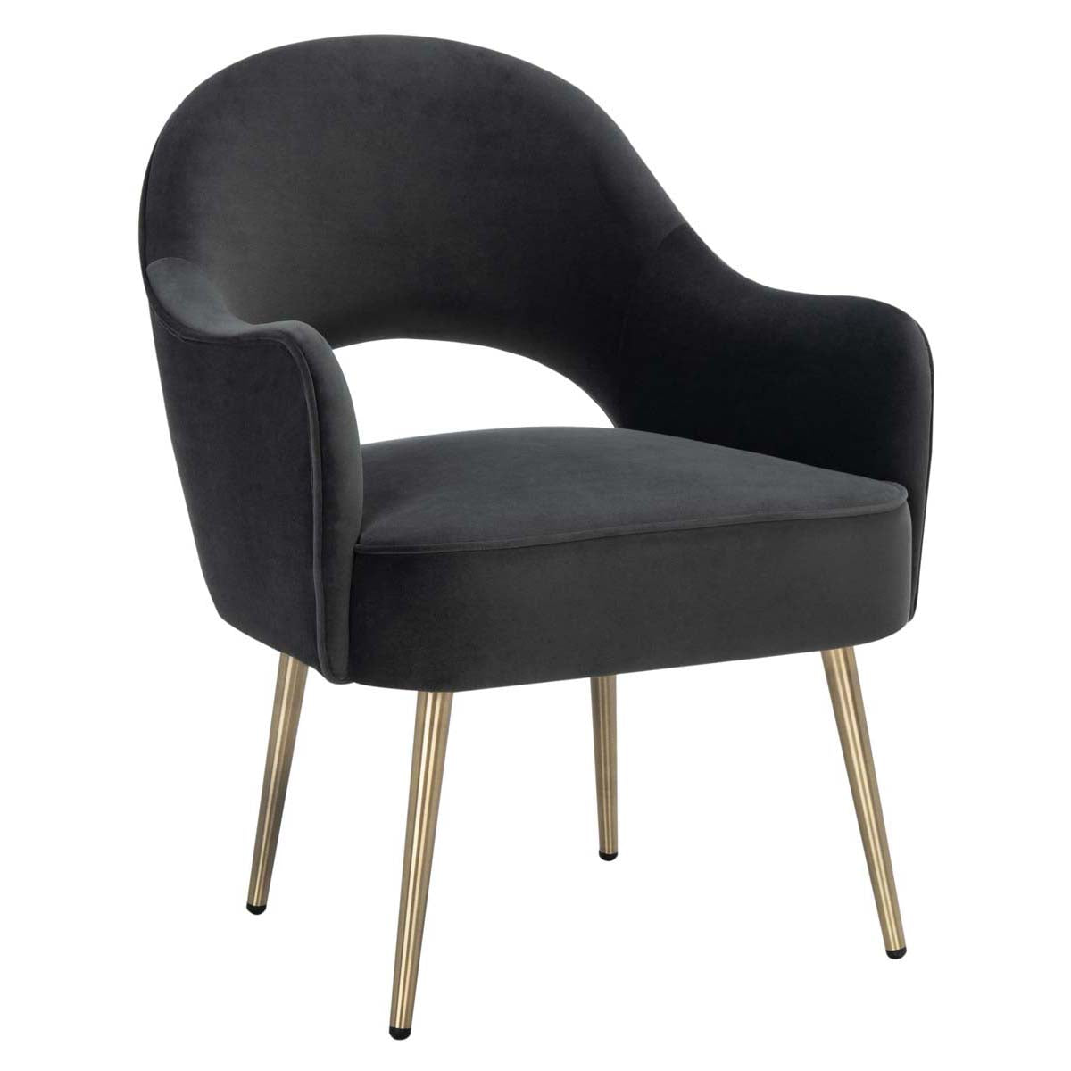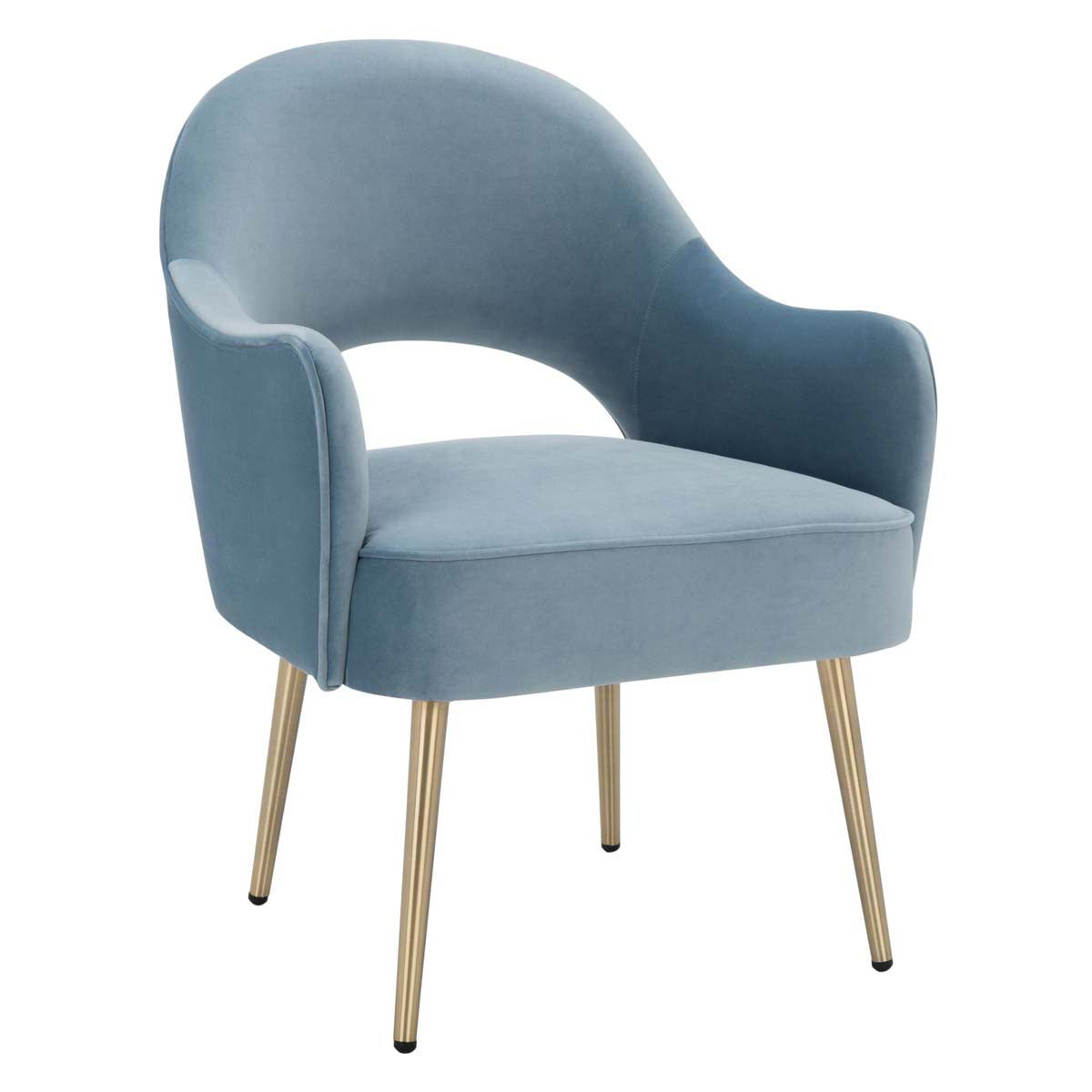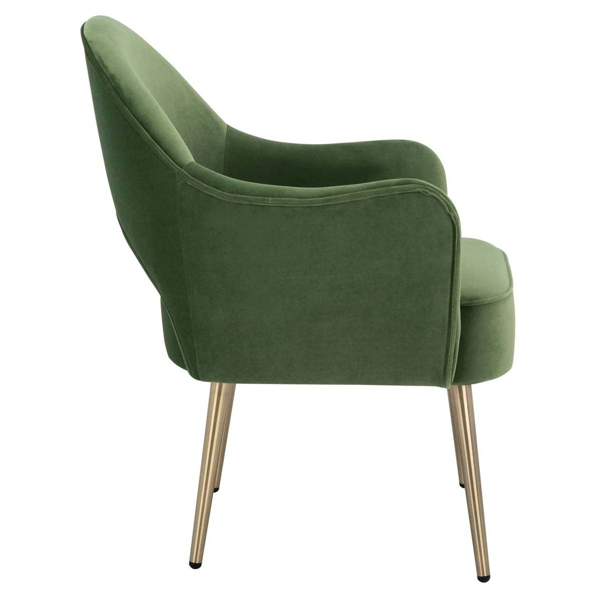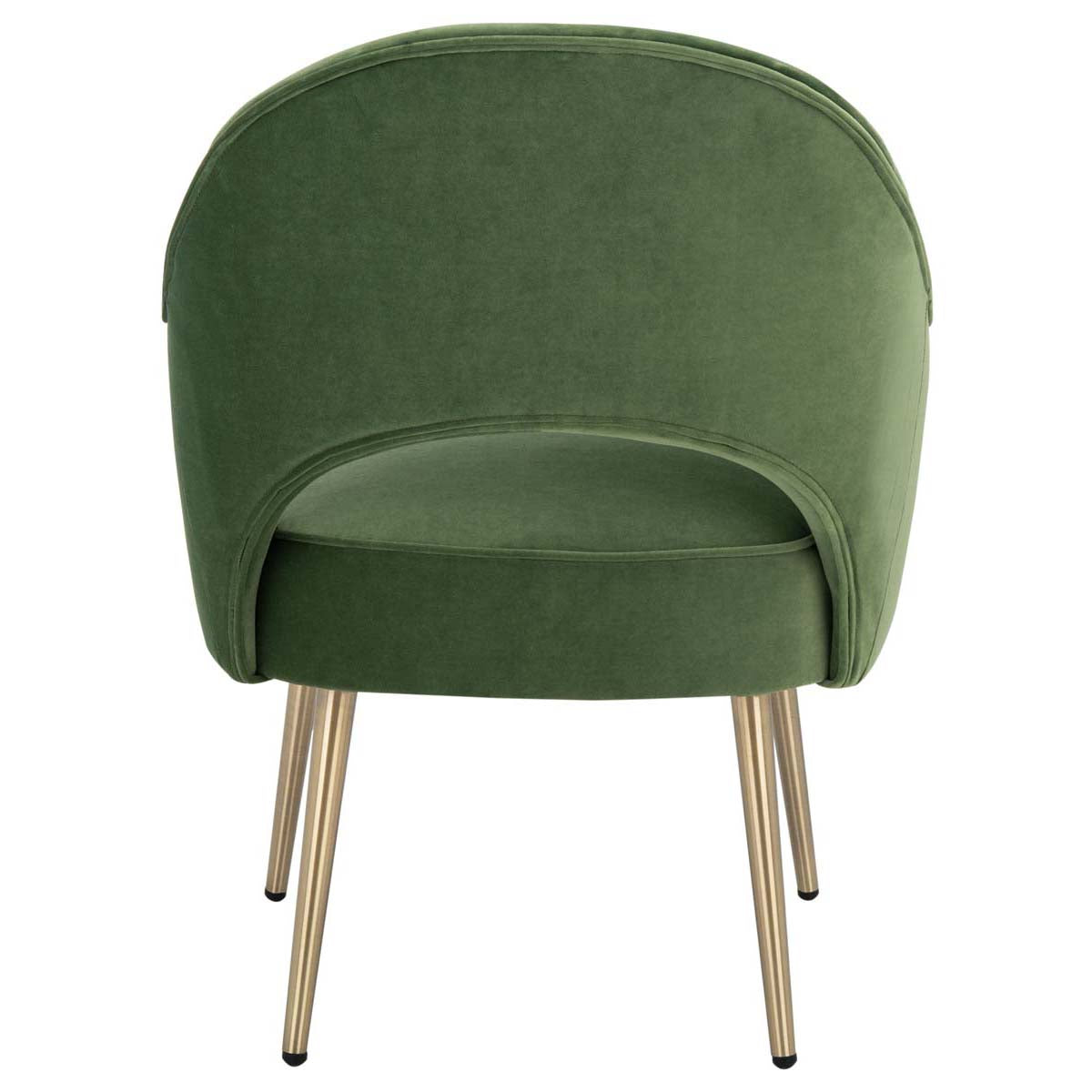 A glamorous modern take on retro charm, this Dublyn Accent Chair abounds with fashion-forward appeal. Dublyn redefines the classic club silhouette with a cut-out back and gently sculpted arms in luxuriously soft green velvet, while tapered gold metal legs complete the look.