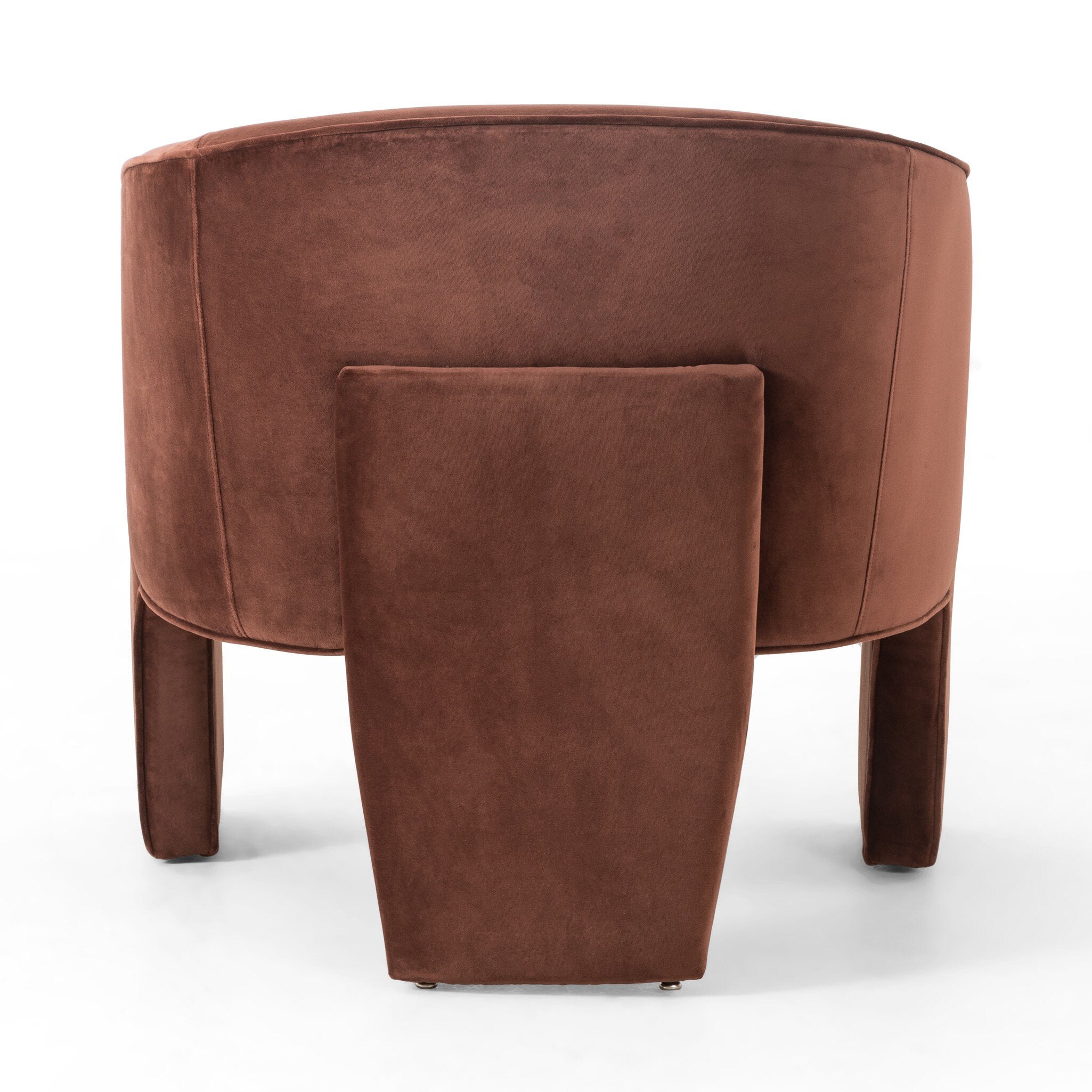 A unique three-leg dining chair is upholstered in a soft auburn velvet to showcase a luxurious look designed for real life.