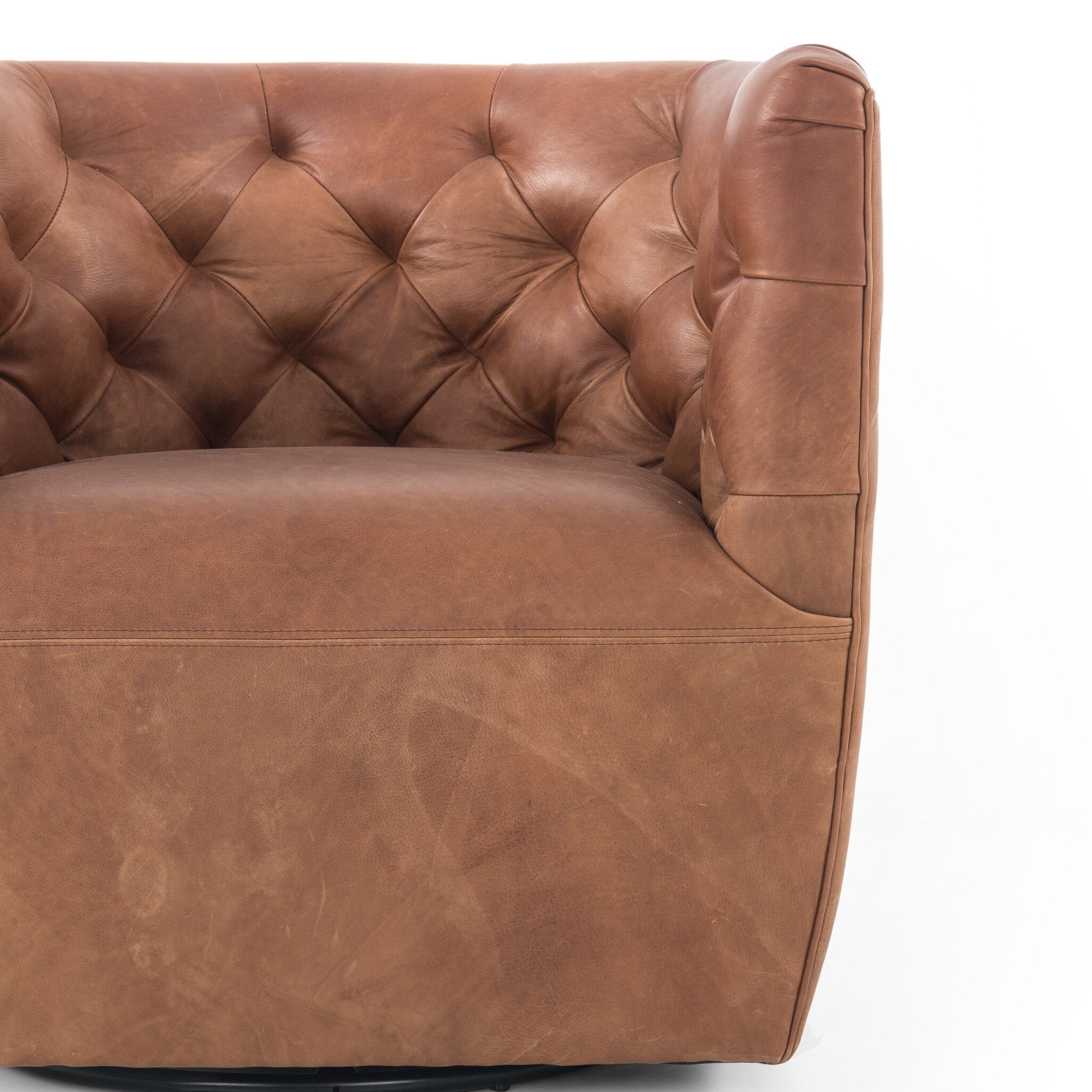 A perfectly curved statement on a 360 swivel. Soft heirloom top-grain leather is pristinely tailored, with dramatic blind tufting and high, shapely arms. Sourced from one of the oldest family-owned tanneries in Italy’s Bassano del Grappa, our heirloom leather covering is salvaged and processed from upcycled hides featuring an abundance of natural markings, scars and color variations. The result? Beautifully supple, buttery soft hides with an unmatched depth of color and richness, and an authentic lived-in look.