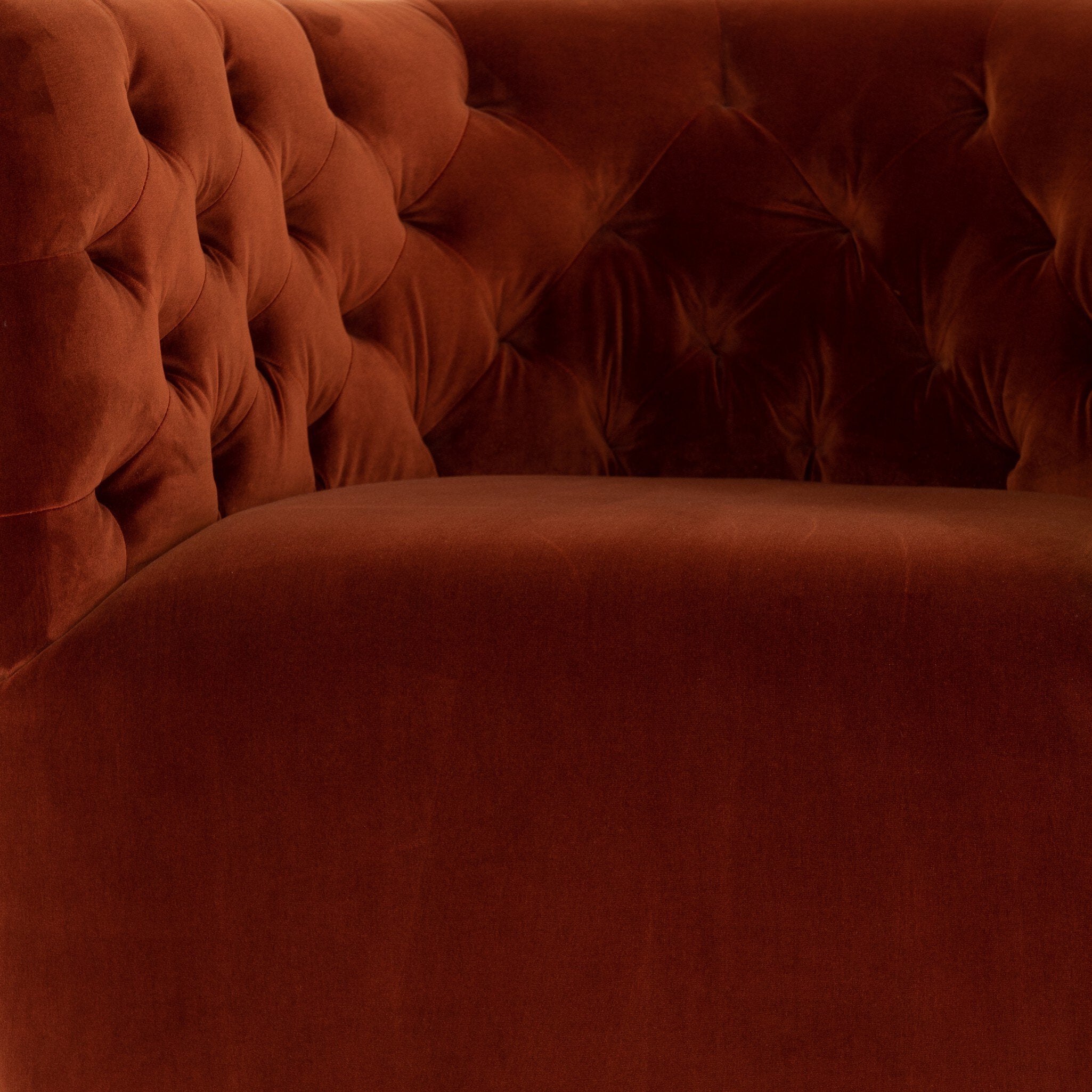 A perfectly curved statement on a swivel. Velvety rust-colored upholstery is pristinely tailored, with dramatic blind tufting and high, shapely arms.