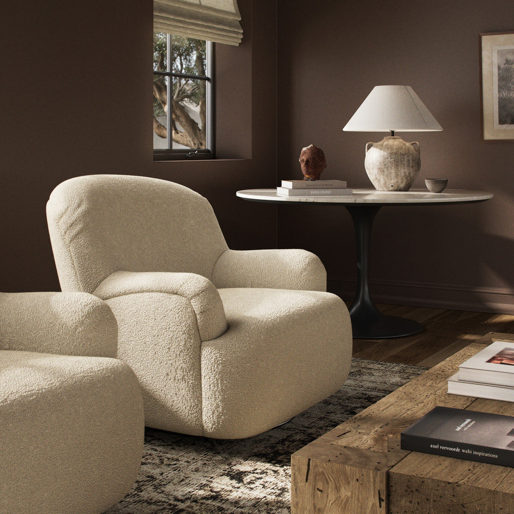 Simply classic. A high wing back pairs with softly rolled arms for a curvy look and supportive sit. Cream shearling-like upholstery invites you to sit and stay a while.