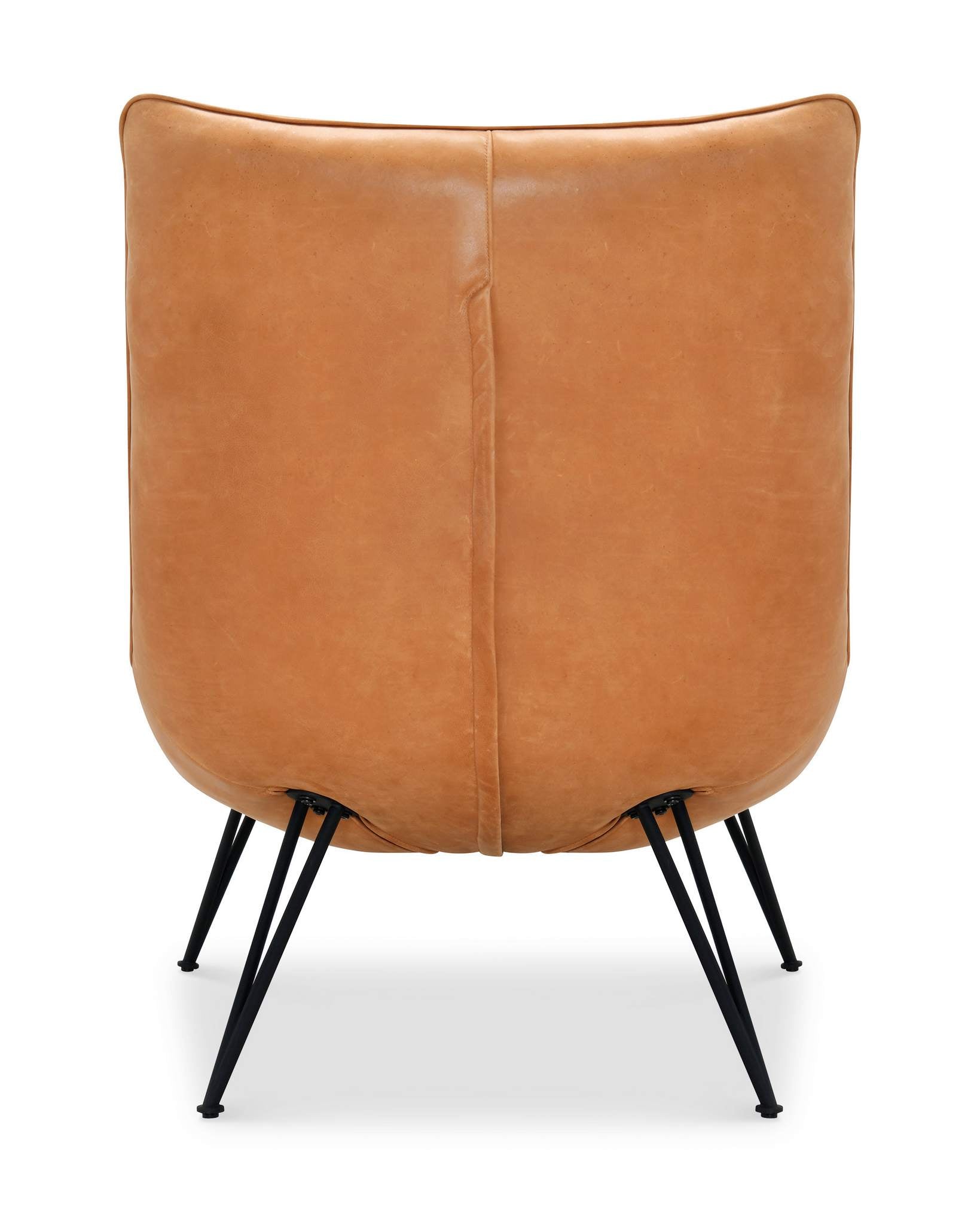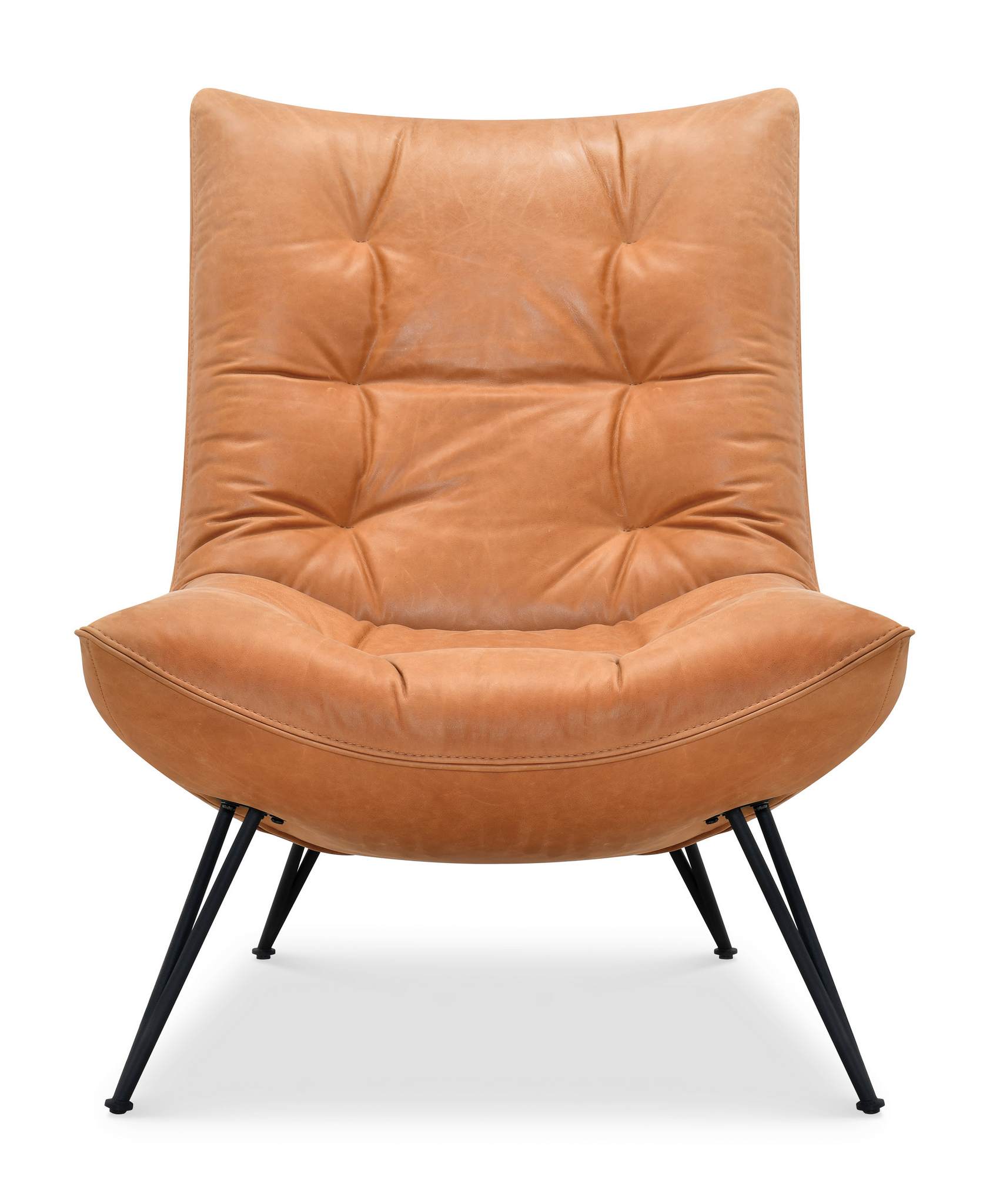 Modern luxury meets tailored comfort in the Kayne Accent Chair, upholstered in rich Saddlebag Coin aniline leather. With a tufted seat and back, sleek armless silhouette, and black metal spindle legs, this contemporary club chair delivers a minimalist profile with designer impact. Ideal for bold interiors that embrace form and texture.