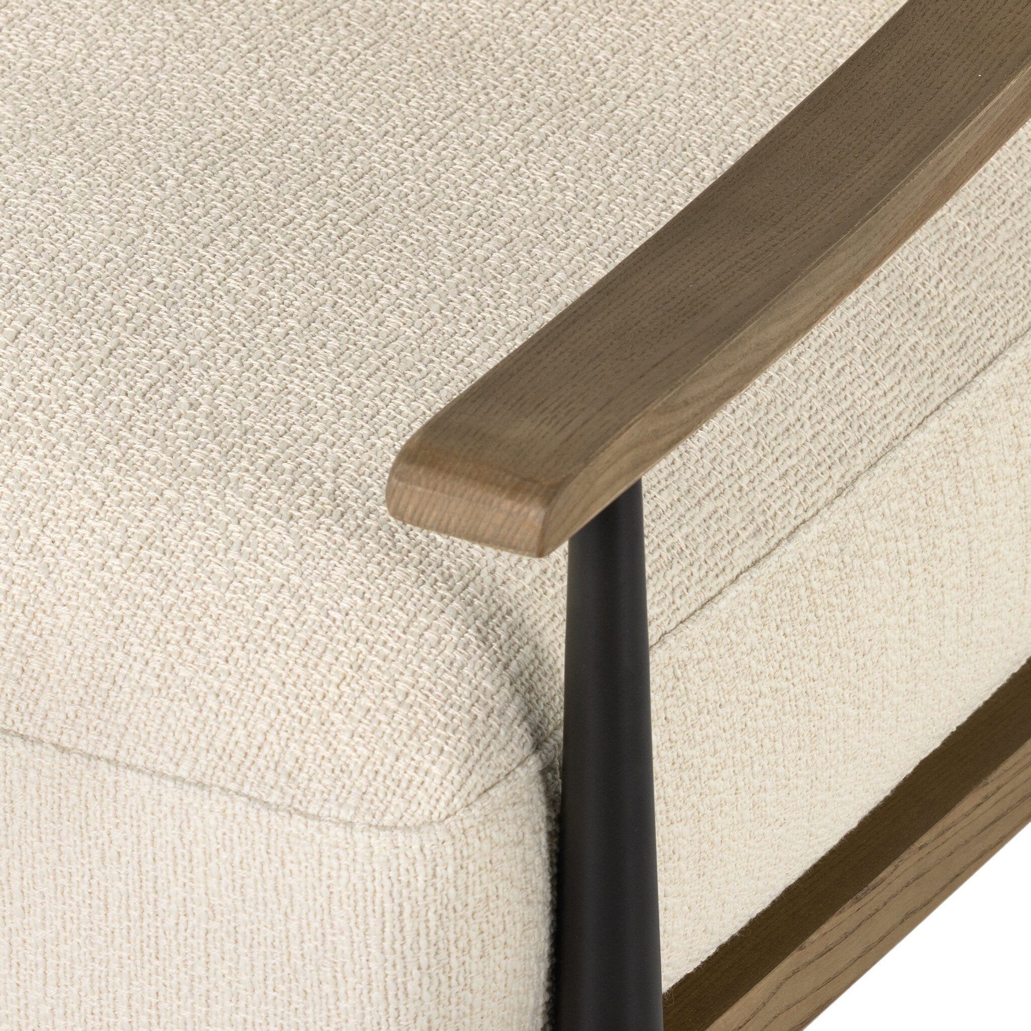 Comfort and class in one chic silhouette. Sloped wooden arms and forged legs frame cushy feather-blend seating covered in a textural ivory, striking great tonal balance between warm and cool. Performance fabrics are specially created to withstand spills, stains, high traffic and wear, ensuring long-term comfort and unmatched durability.
