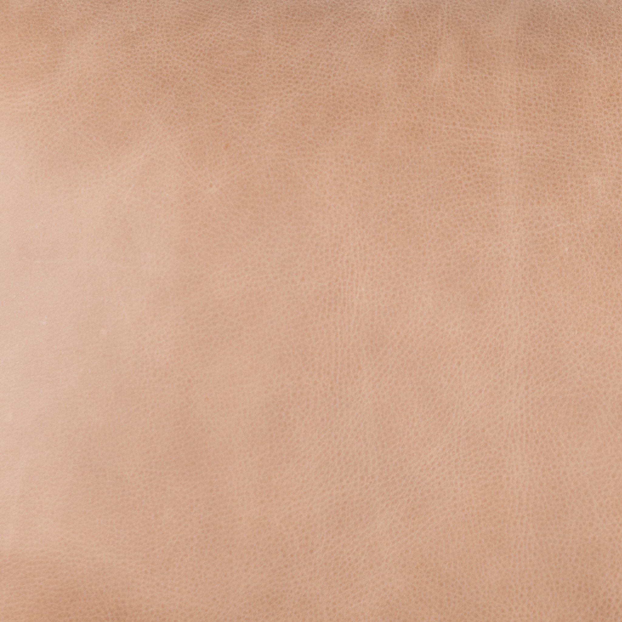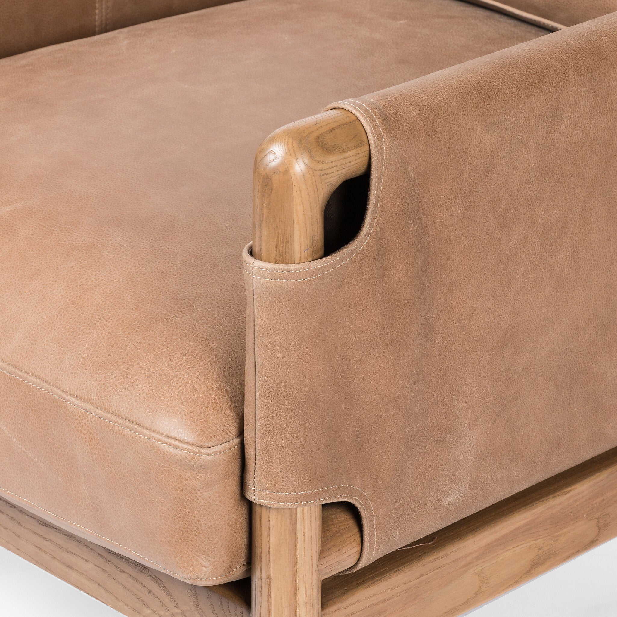 Safari inspiration meets zen aspirations. A cylindrical frame is crafted, smoothed and rounded from solid ash wood. Includes two loose feather-blend cushions covered in subtly distressed thick cut leather in a neutral taupe hue for a monochromatic look.