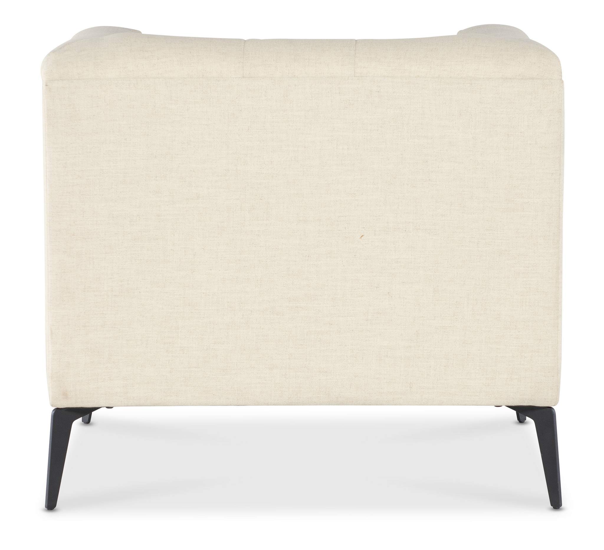 The Nicolla Stationary Chair in Baldwin Natural performance fabric offers a stylish, modern traditional design. With a chesterfield-inspired shelter arm design and button tufted interior, the chair stands out with its light, airy appearance, thanks to tall matte black metal tapered legs. The heathered two-tone sand-colored flat weave fabric provides durability and texture, making this chair a timeless addition to any living room.