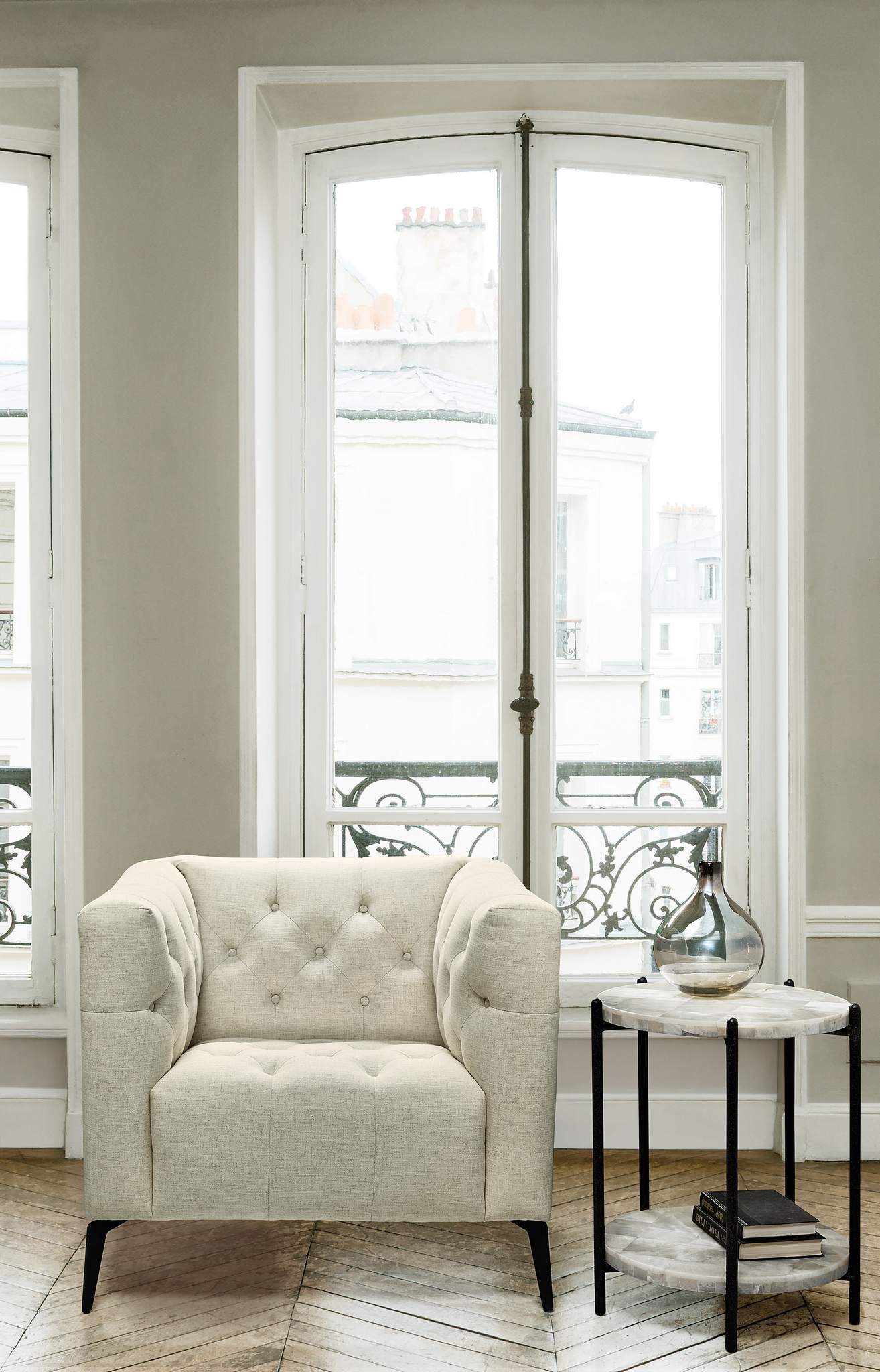 Light and airy with tall matte black metal tapered legs