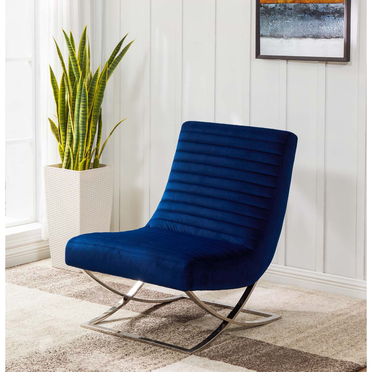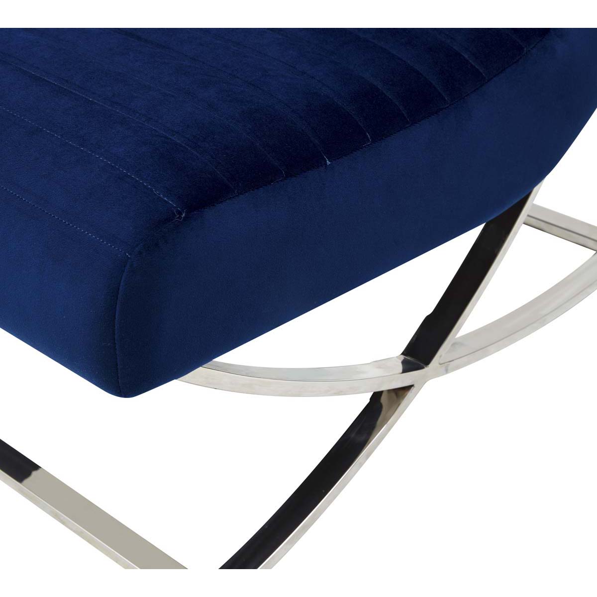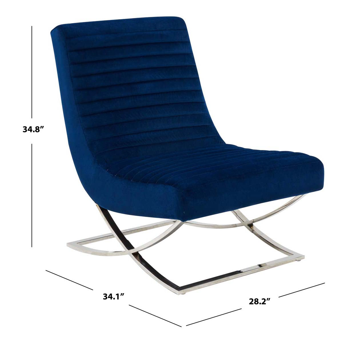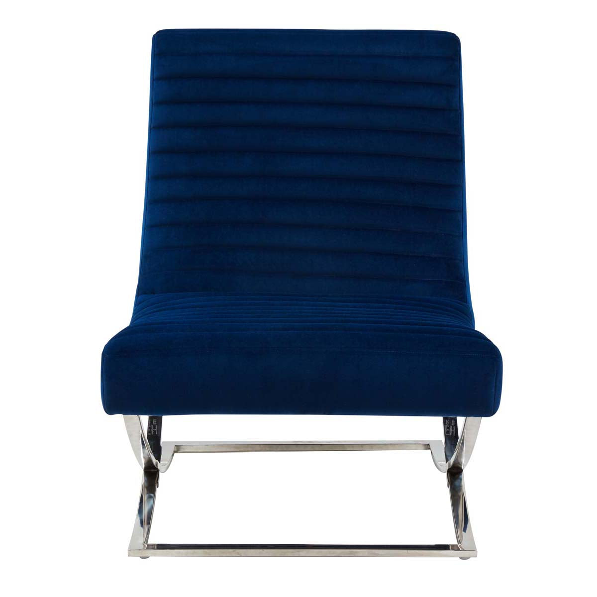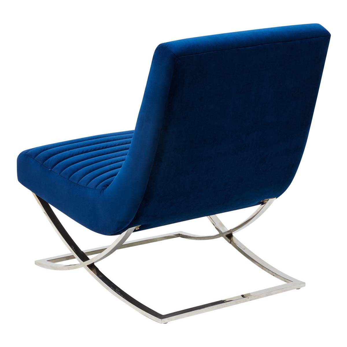 A new take on a retro classic, this Ramsay Accent Chair emanates eye catching elegance. Ramsays channel tufted navy velvet is luxuriously plush, and a Barcelona inspired base in silver stainless steel pairs perfectly with the flowing curves of its familiar silhouette.