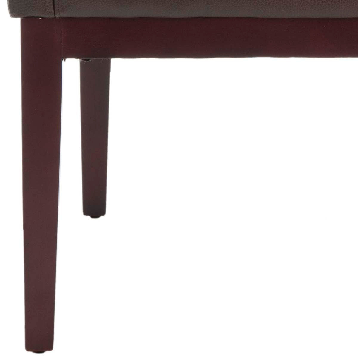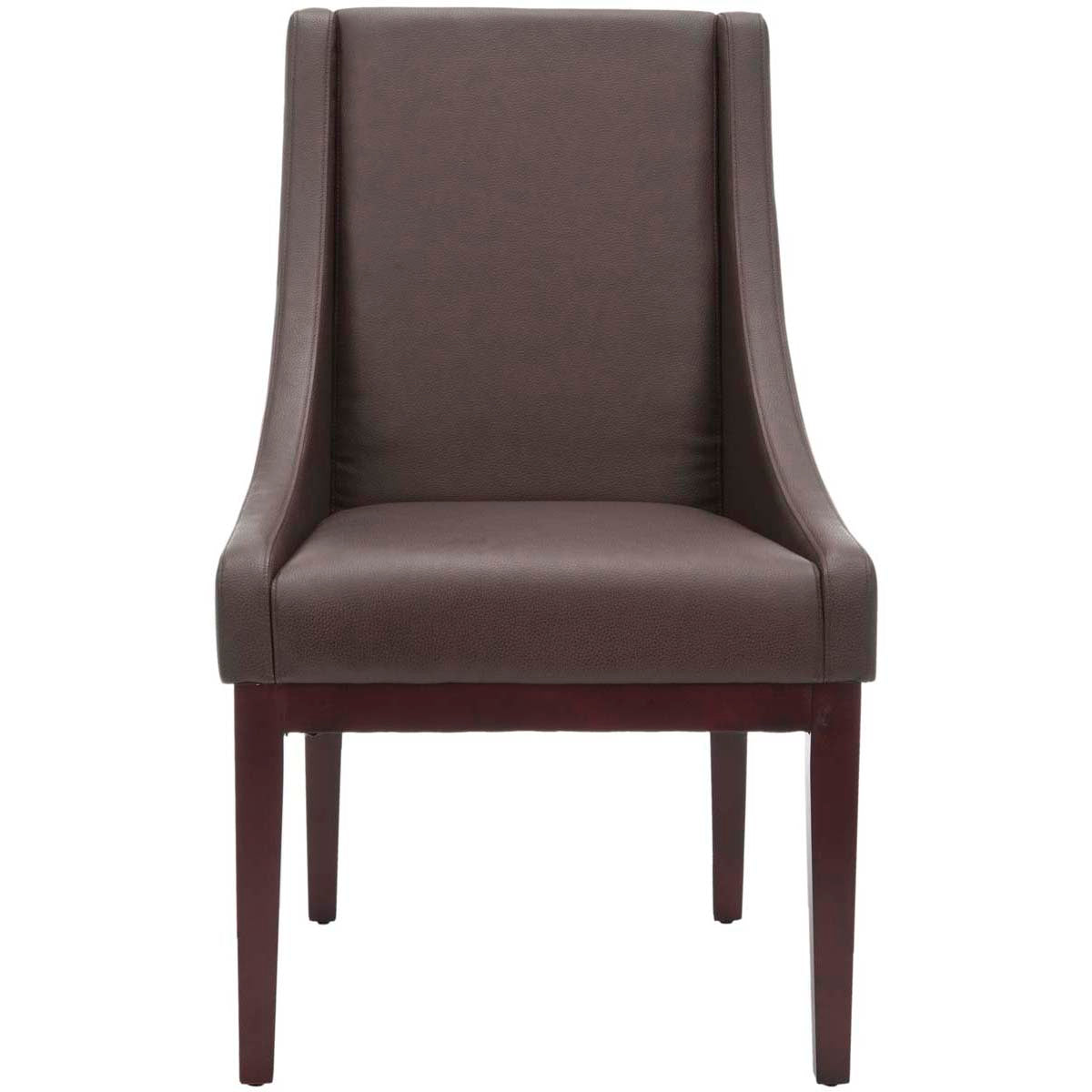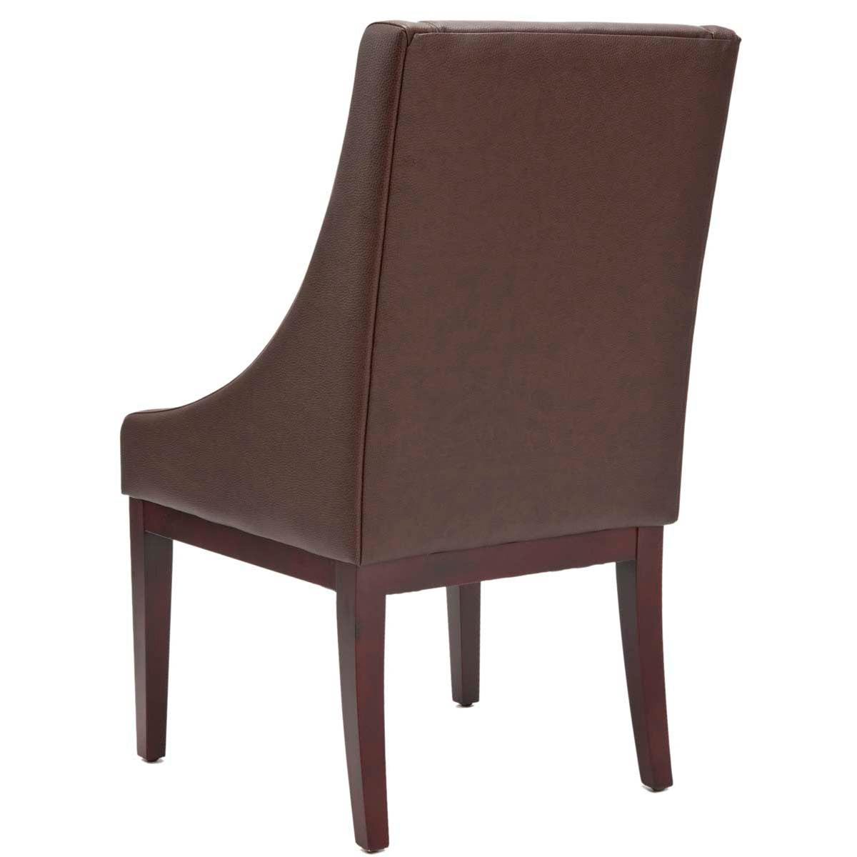 The simplicity of lines and gently sloping arms of the brown leather upholstered Sloping chair, with legs in dark cherry finish, prove an elegant combination. Slope can dress up casual country dining rooms, add class to classic settings and even rest at ease in contemporary homes.