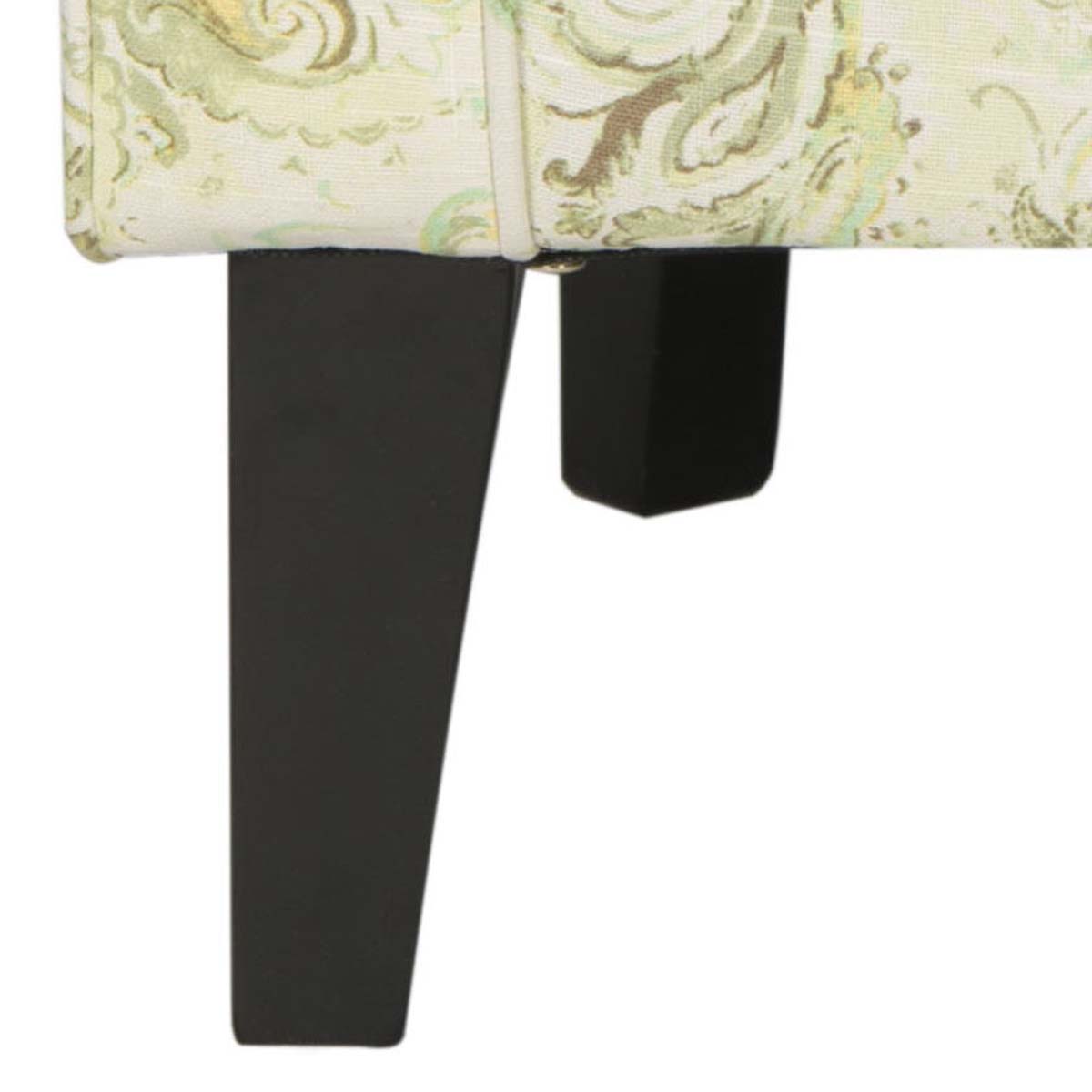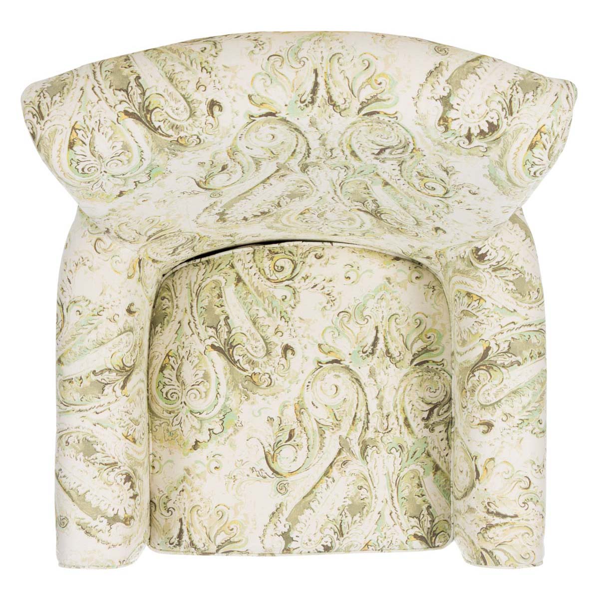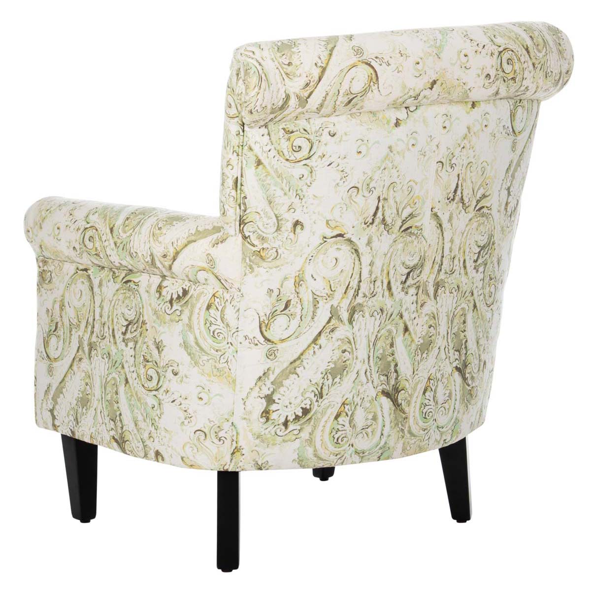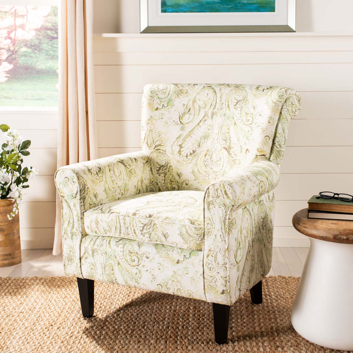 The classic roll arm of the Hazina Club Chair gets updated thanks to a traditional spring green paisley print in a crisp cotton linen blend. Standing atop espresso finished legs of strong, solid wood, Hazina is glorious in a living room, family room, or master suite.