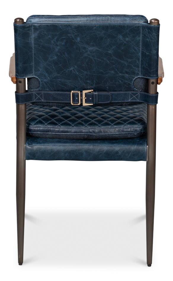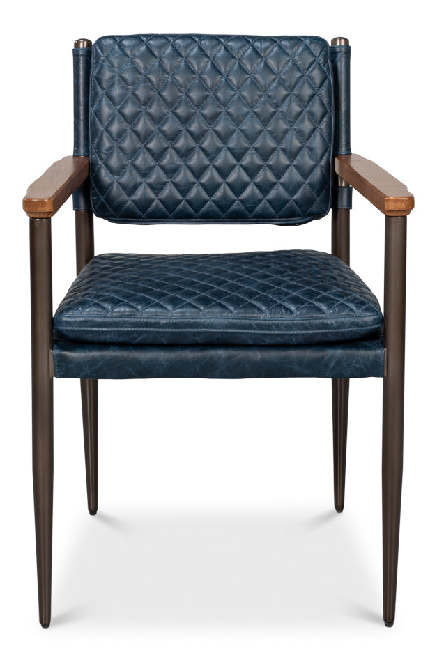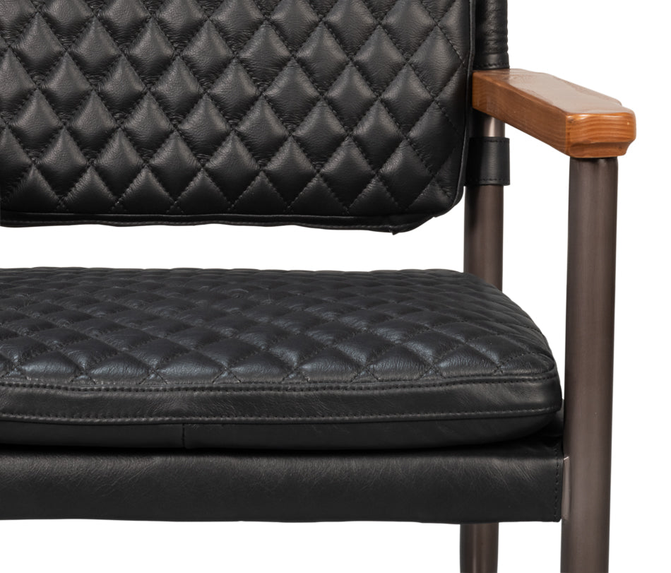 So many applications come to mind for this chair. Commercially it could be used in hotel lobbies, in waiting rooms, and in dining rooms. Quilted leather. Metal frame and wooden arms. Pure Aniline top grade cow leather. Avoid direct exposure to sunlight / heat some color variation is common and acceptable on vintage leather.