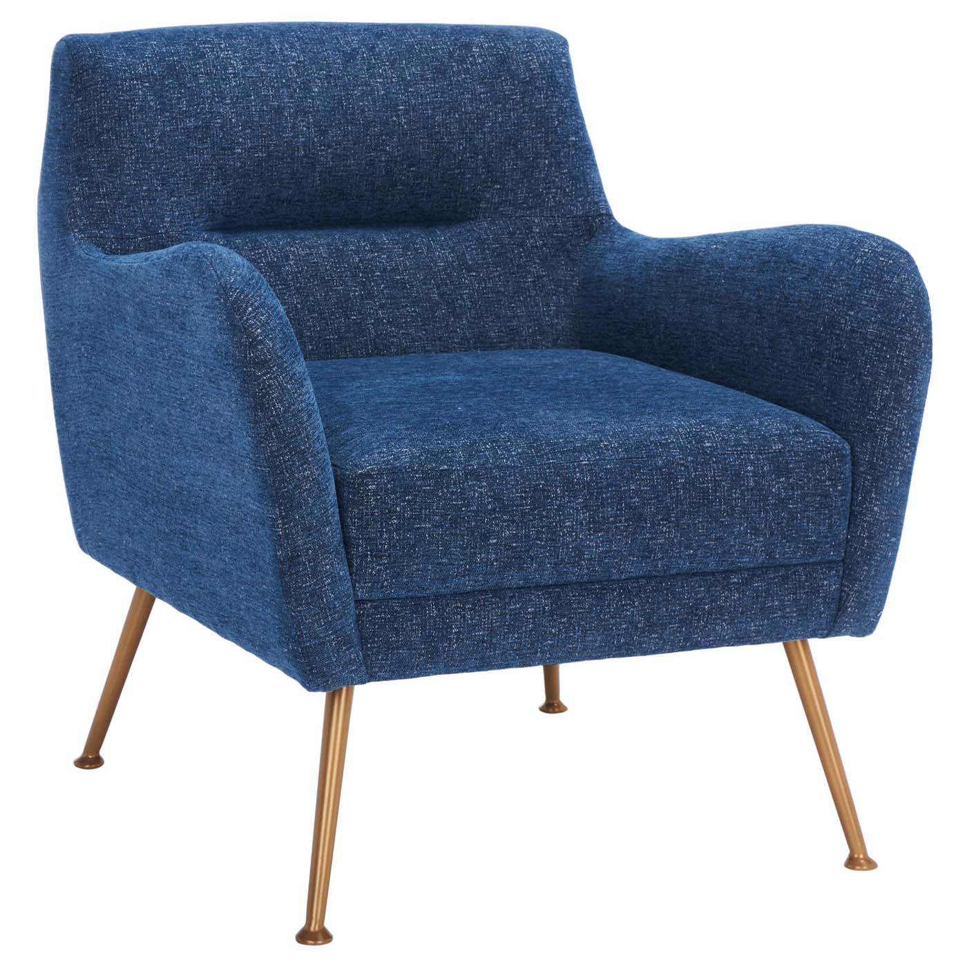 Embrace the art of relaxation in style with this Tilbrook Armchair. Sloped arms and a classic wraparound profile in plush navy upholstery envelop you in stylish luxury, while gold retro legs give Tilbrook a touch of Mid-Century glam.