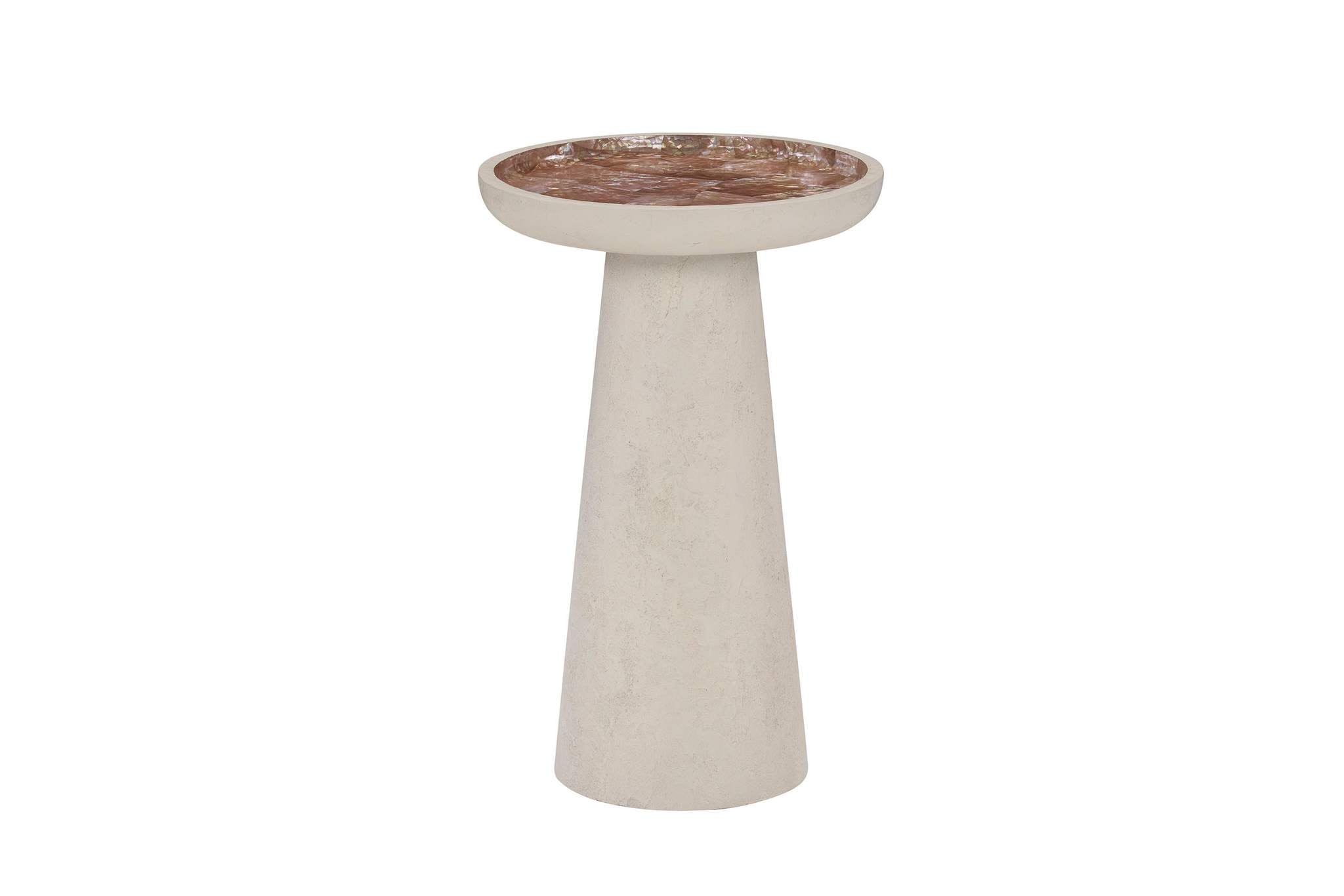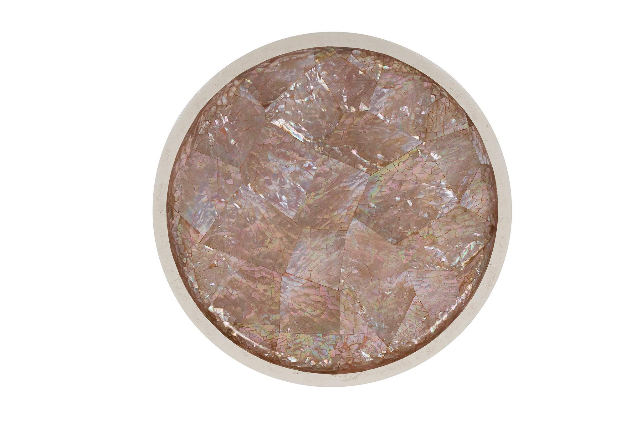 The Alina Spot Table boasts a striking pink crackle shell coved top set on a textured white gesso base, offering a captivating contrast. Its vibrant design brings the perfect pop of color to any setting. Only available as shown.