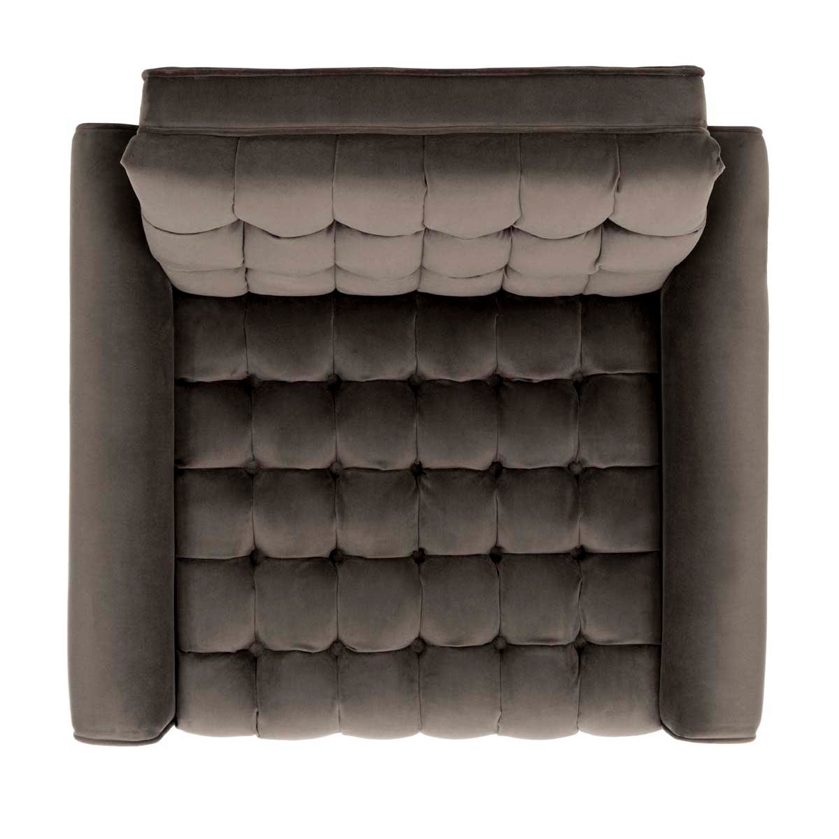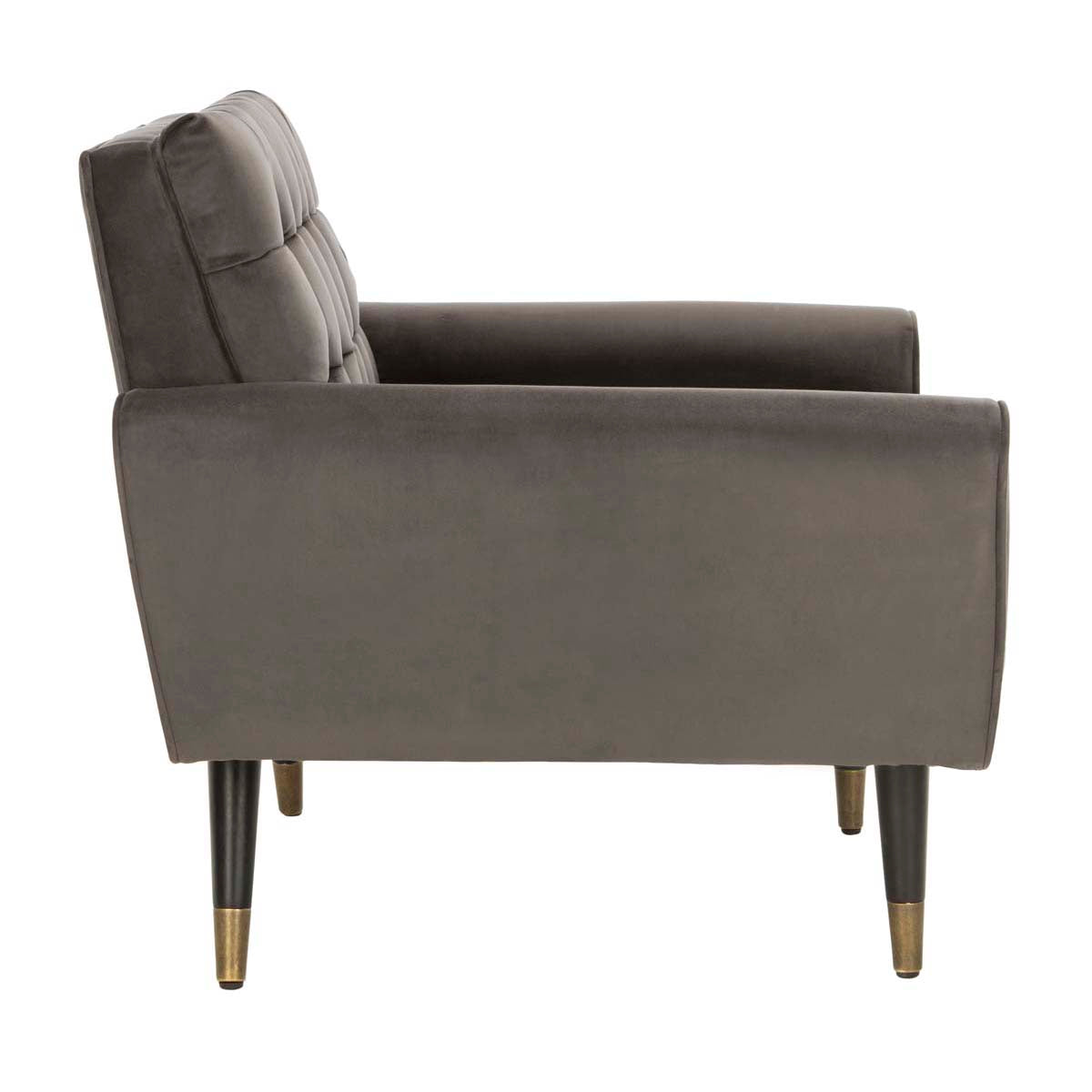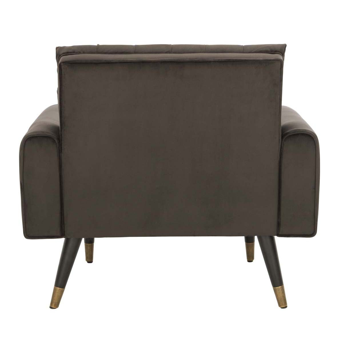 Update your living room with this Amaris Accent Chair, a contemporary spin on a retro classic. Inspired by Mid Century design, Amaris features generously filled shale velvet upholstery that's perfectly embellished with rich button tufting. Vintage style black legs and sleek brass caps complete the look.