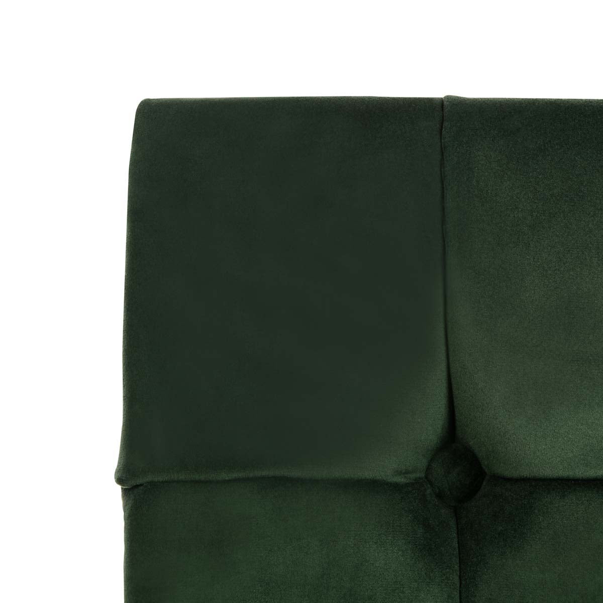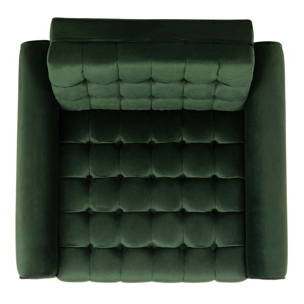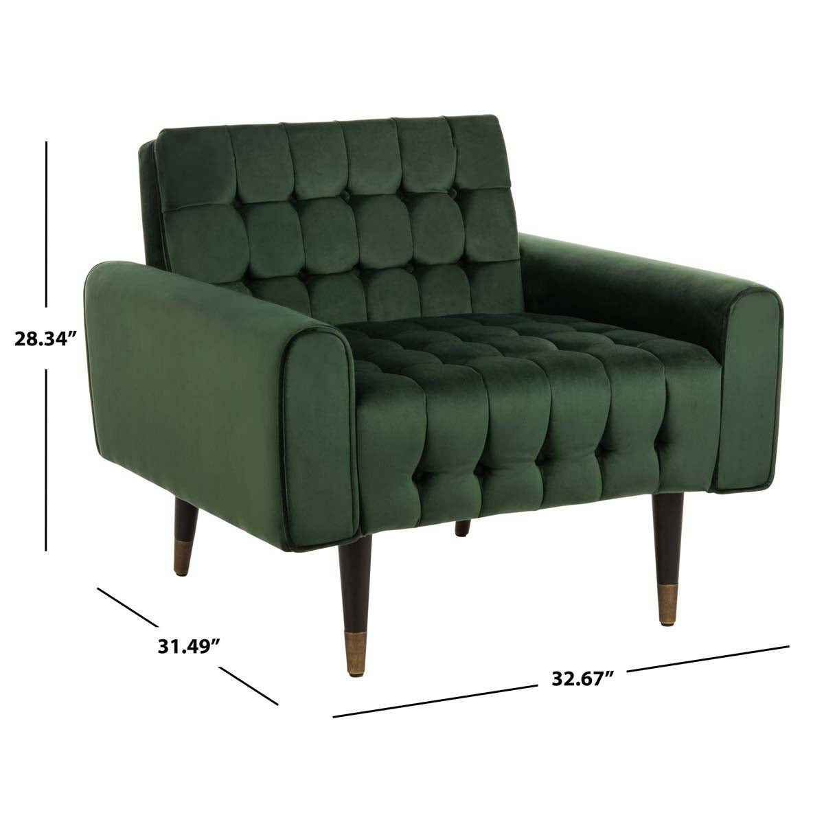 Update your living room with this Amaris Accent Chair, a contemporary spin on a retro classic. Inspired by Mid Century design, Amaris features generously filled forest green velvet that's perfectly embellished with rich button tufting. Vintage style black legs and sleek brass caps complete the look.