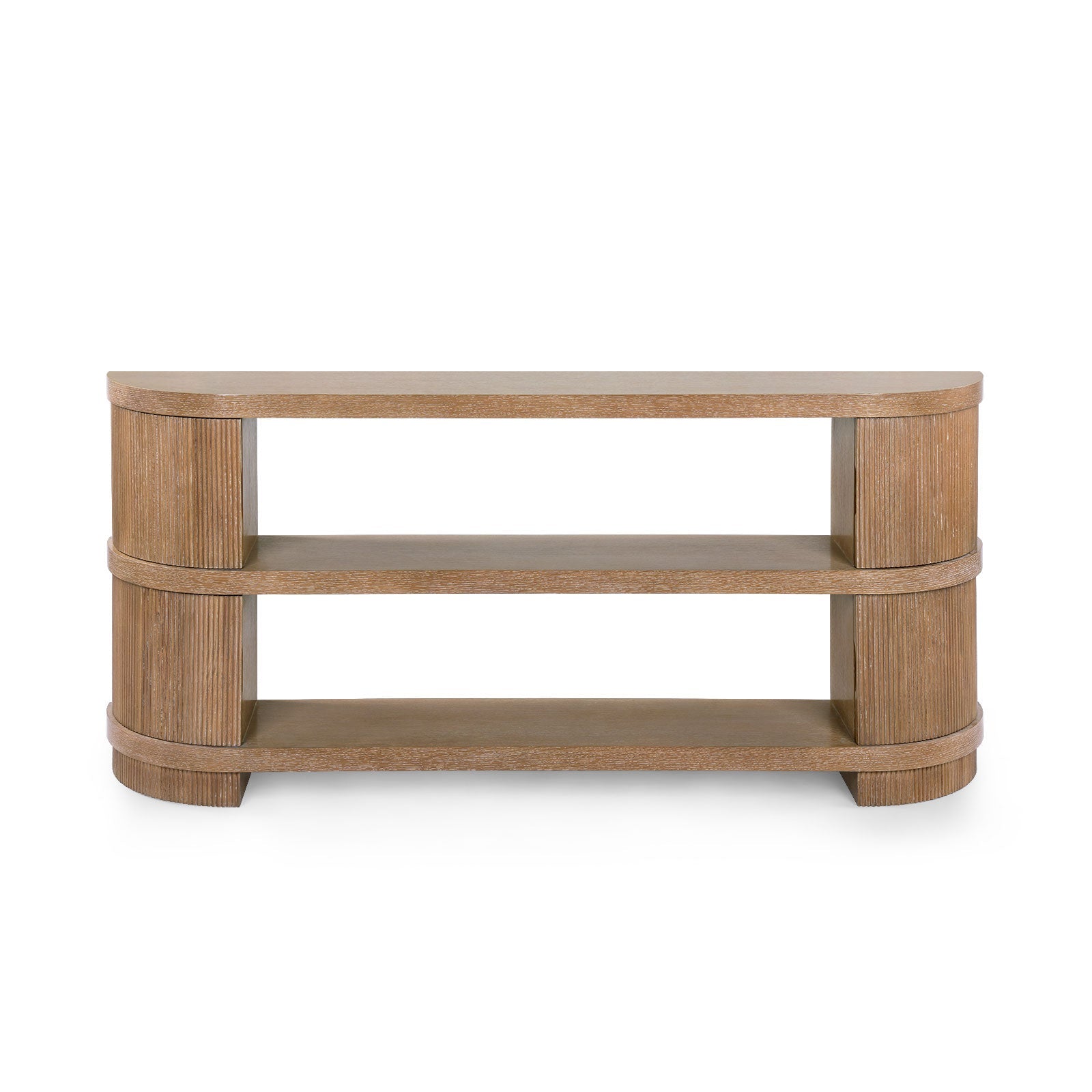 The Atlas Console is a beautifully crafted oak piece that pairs architectural structure with thoughtful design details. Its three-tiered silhouette offers generous surface area for styling and storage, while its ends are elegantly rounded and finished with fluted panels that create a striking visual rhythm. Hidden cabinets on either side are seamlessly integrated, providing concealed storage without disrupting the console’s clean lines. With its graceful curves, layered shelving, and tactile finishes, the Atlas brings depth, utility, and sophistication to any space.