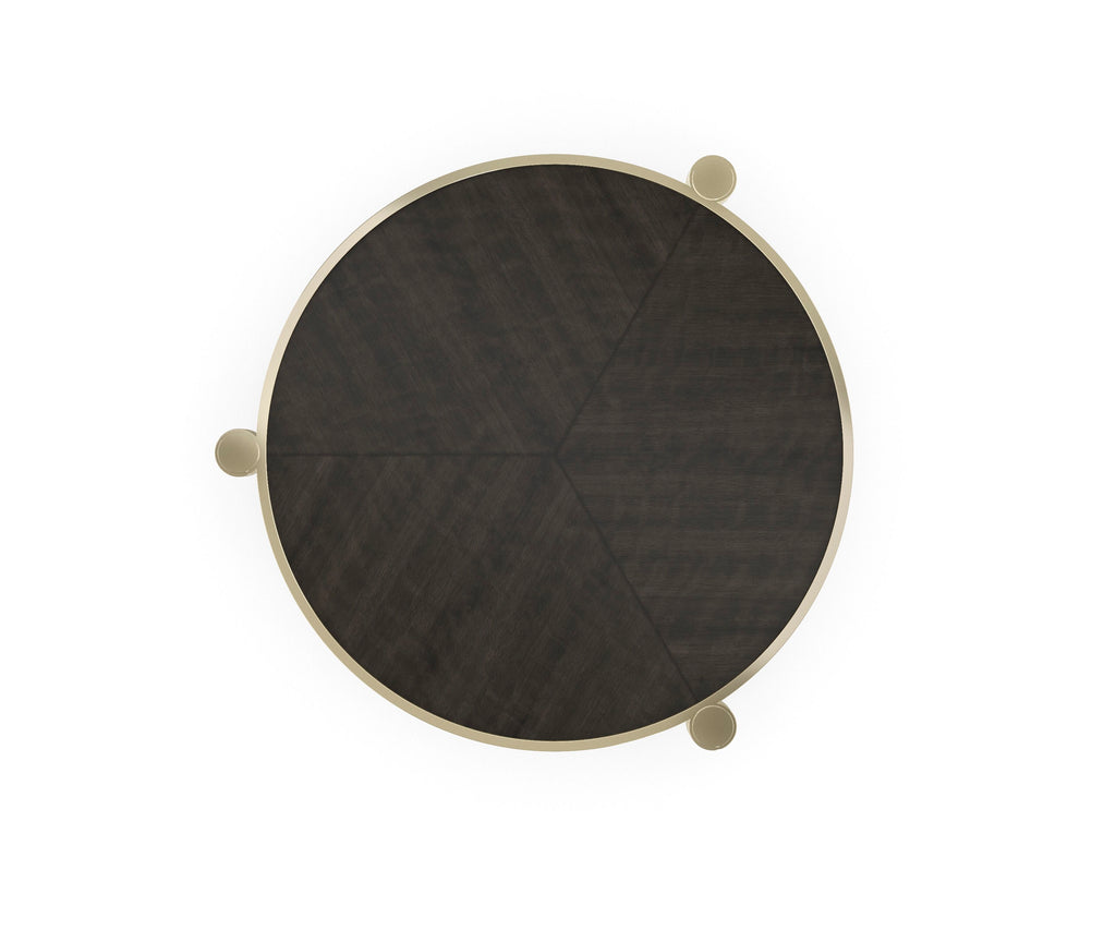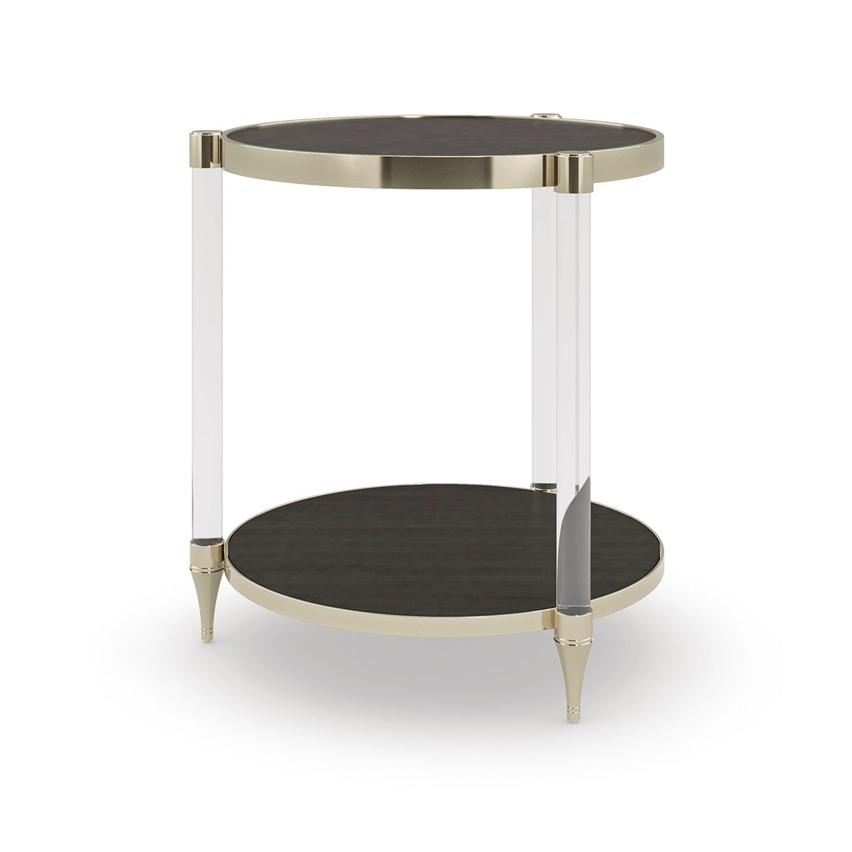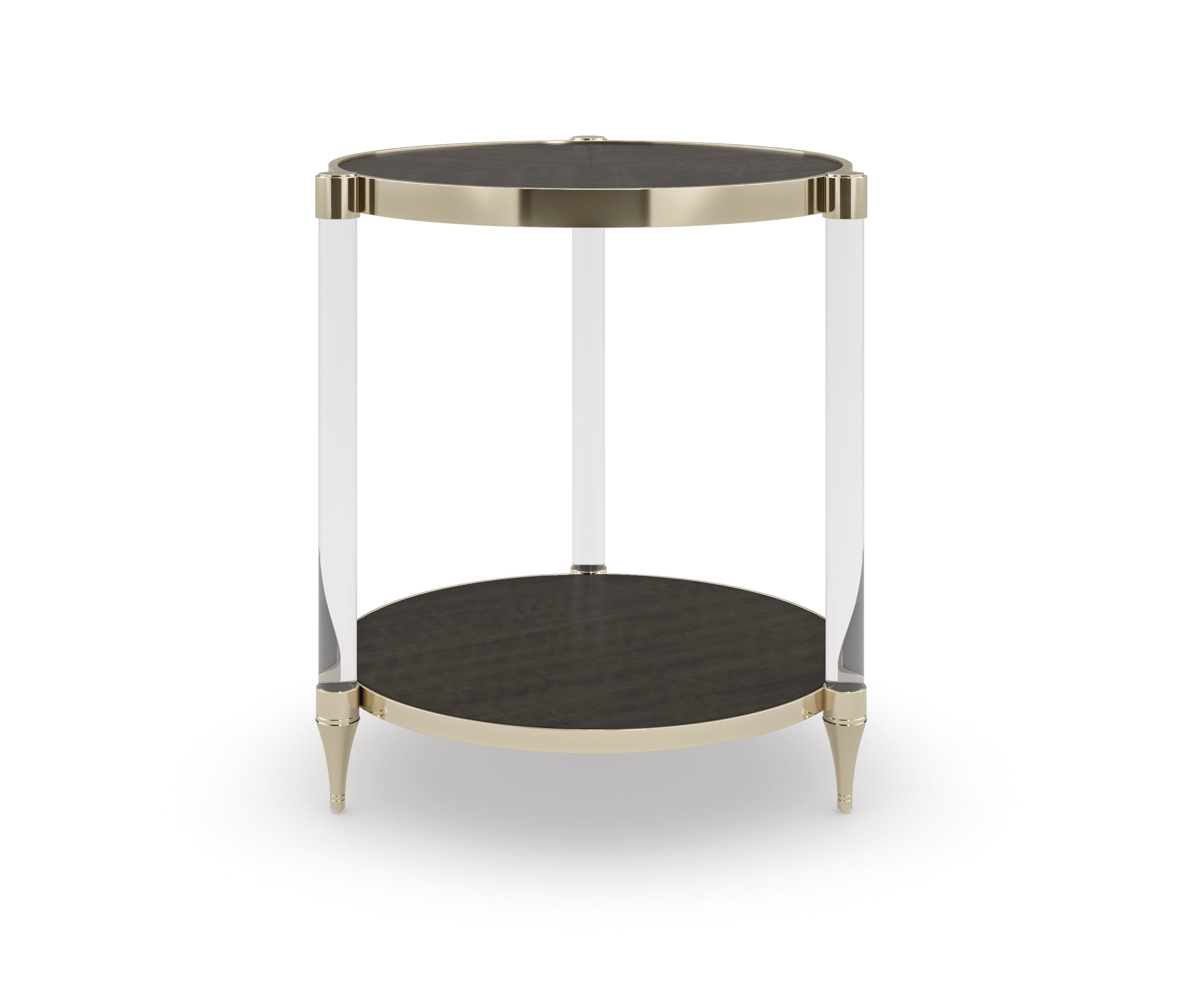 A juxtaposition of materials and finishes punctuates the natural beauty of wood and adds drama to the room with this classic end table. Appearing to float between acrylic posts, the top and bottom shelf are crafted in Makore veneers and finished in Charred Bark. Metal banding in a Whisper of Gold lends a jewelry-like detail and effortless glamour to living interiors and intimate spaces for conversation.