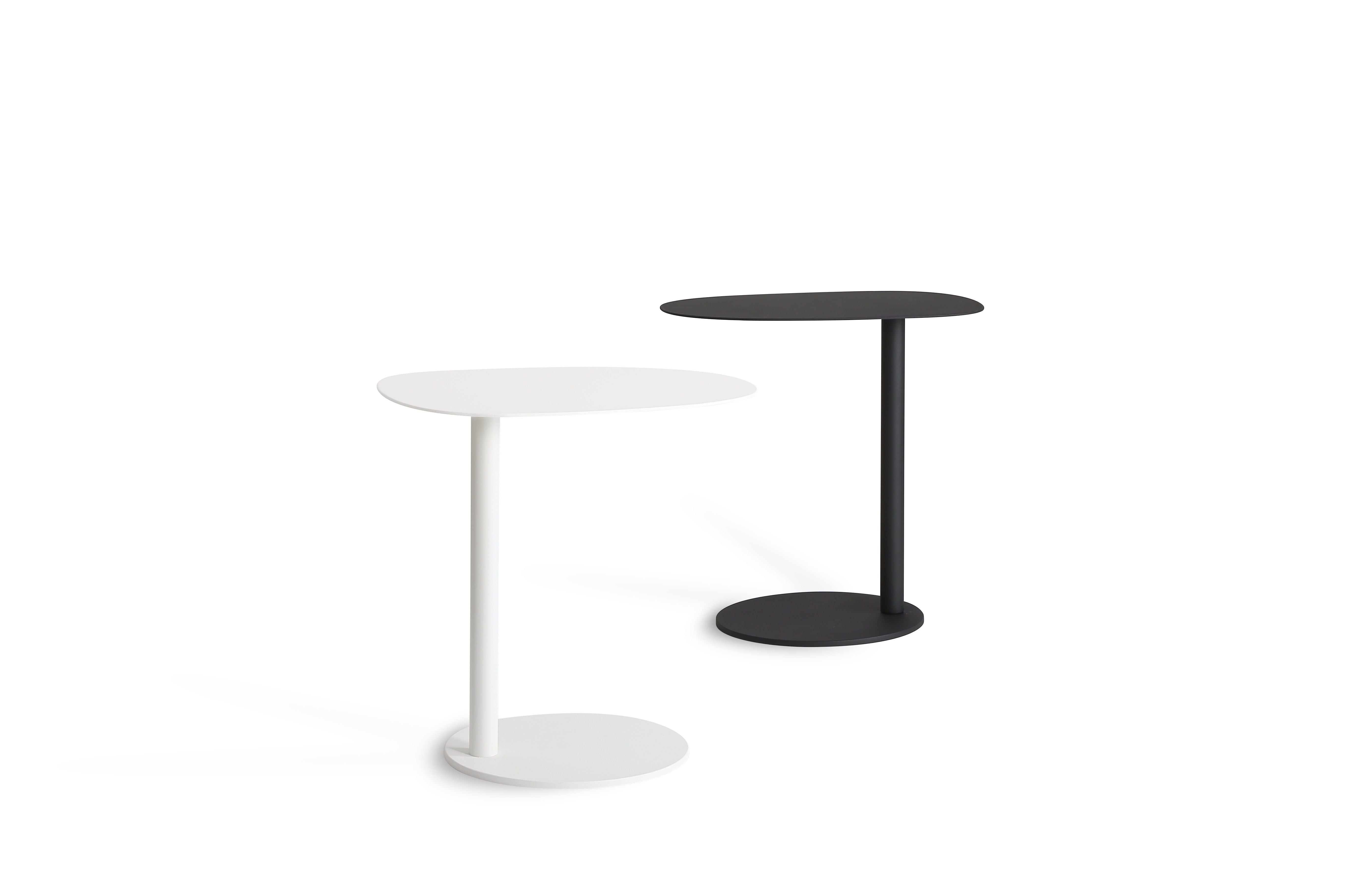 The Perch tables are made from heavy plate steel that has been powder coated in matte black or white. They make the perfect laptop tray at a sofa as it cantelevors over top of the seat. Pull it up between you and a friend and keep your popcorn and beverages close by or use as a stylish end table.