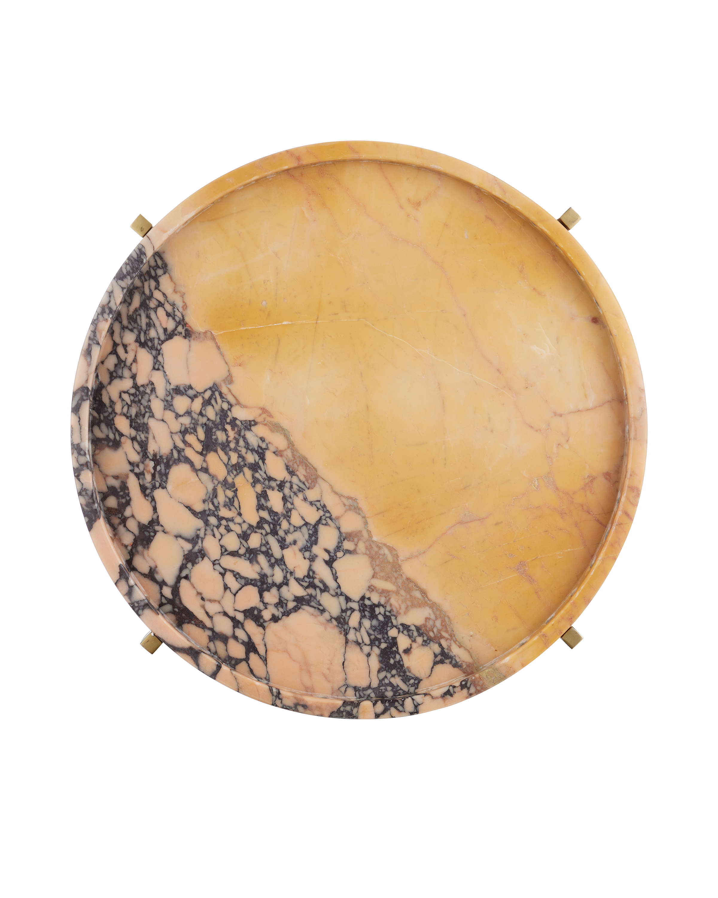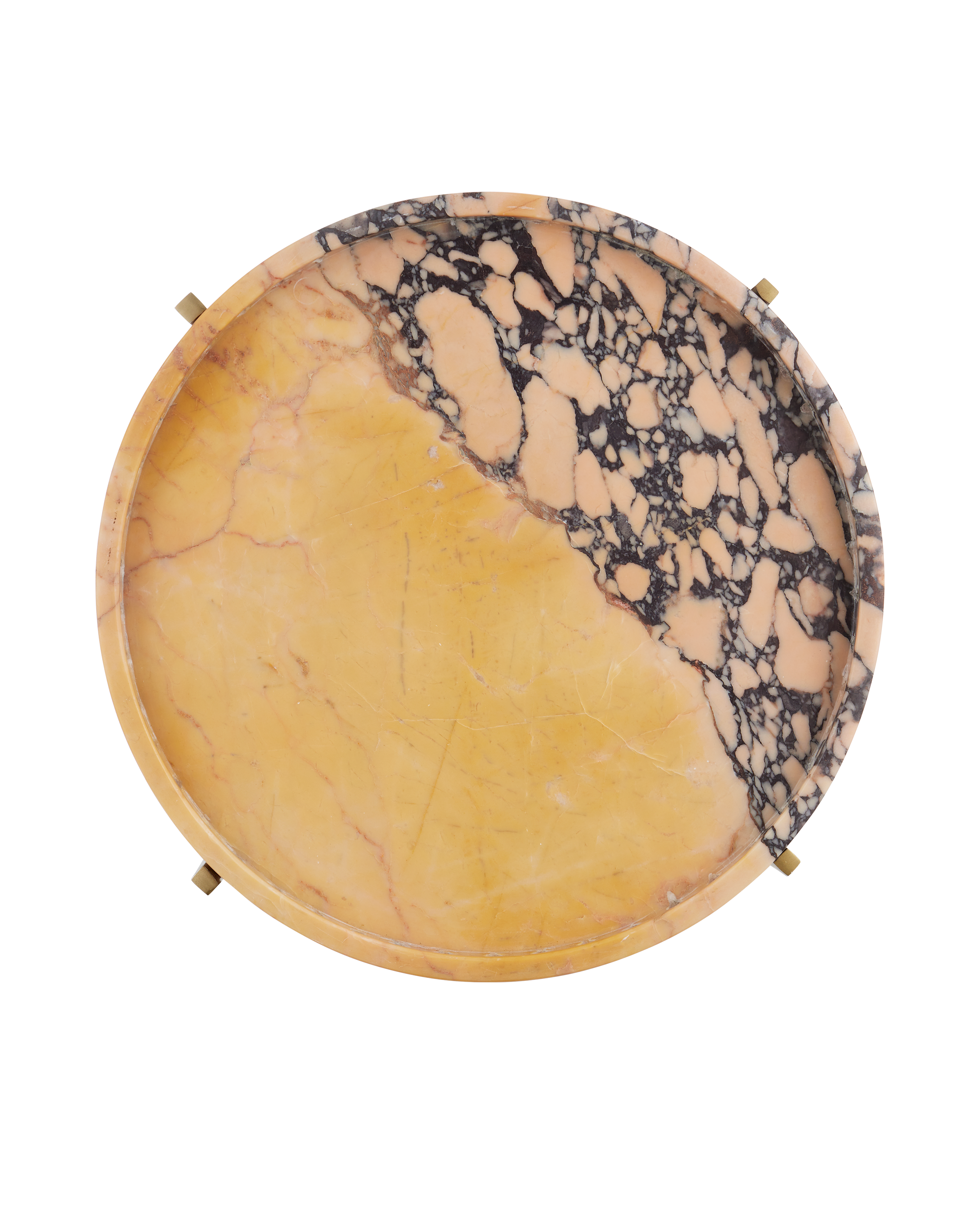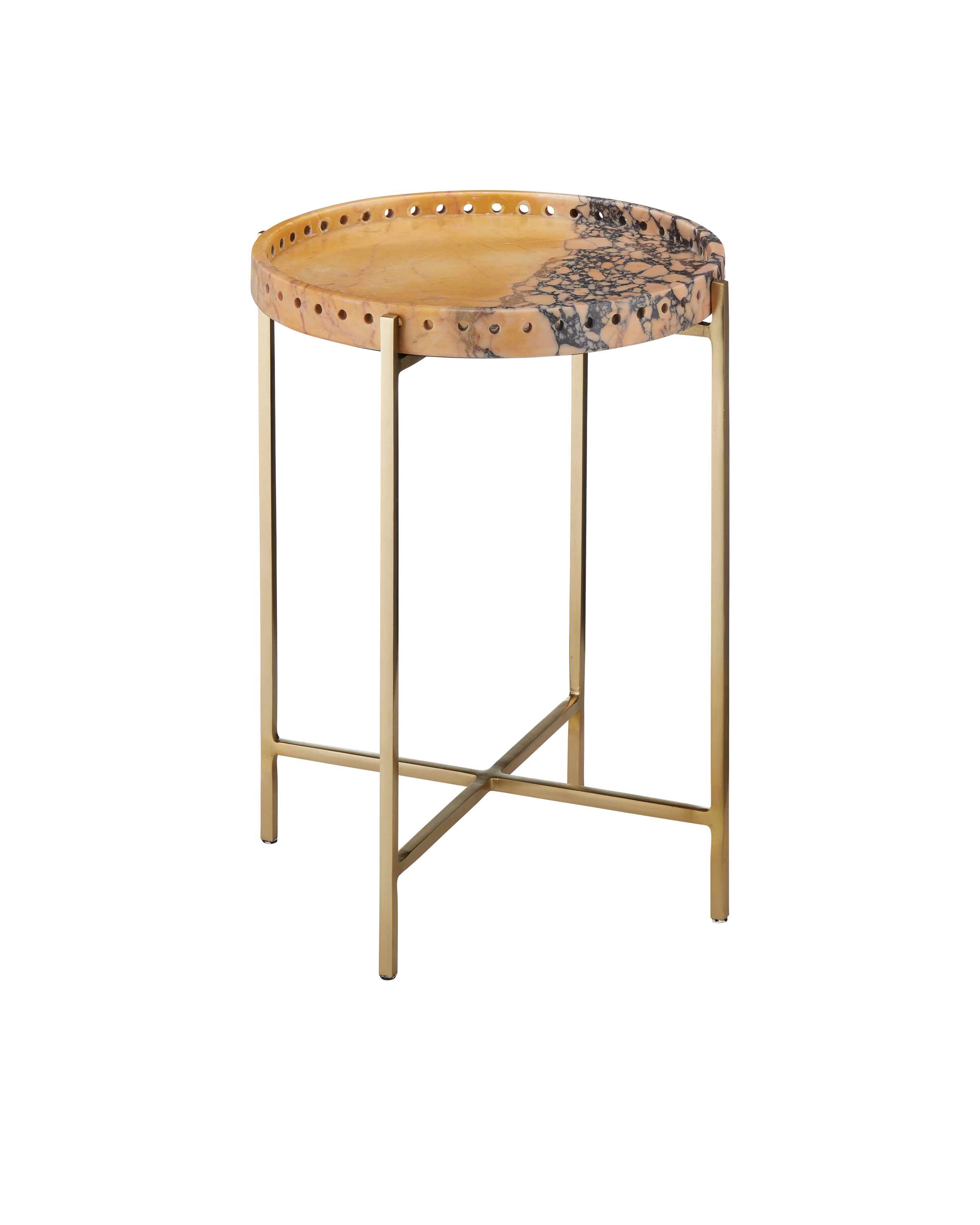 The Freya Breccia Accent Table illustrates how artful nature can be. Made of Purple Breccia marble, the complex patterning of the tray top makes this a natural focal point for any spot in a room. The colors that make this stone so special will vary greatly from pinkish-orange hues to yellows, each with the purple veining that gives the marble its name. The stainless steel frame is in an antique brass finish.