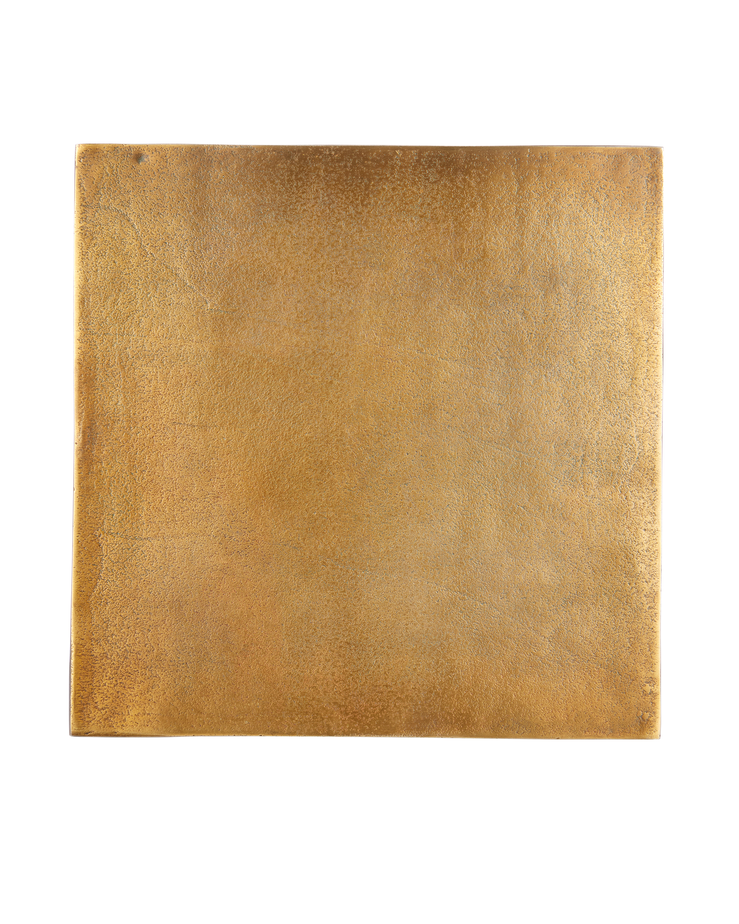 The Gowen Accent Table is a work of art made of cast aluminum in an antique brass finish. The abstract pattern that flows along the exterior on all sides has a brutalist feel. The solid top of the gold accent table has the tell-tale signs of cast aluminum artistry with the drifts of stippling along its surface.
