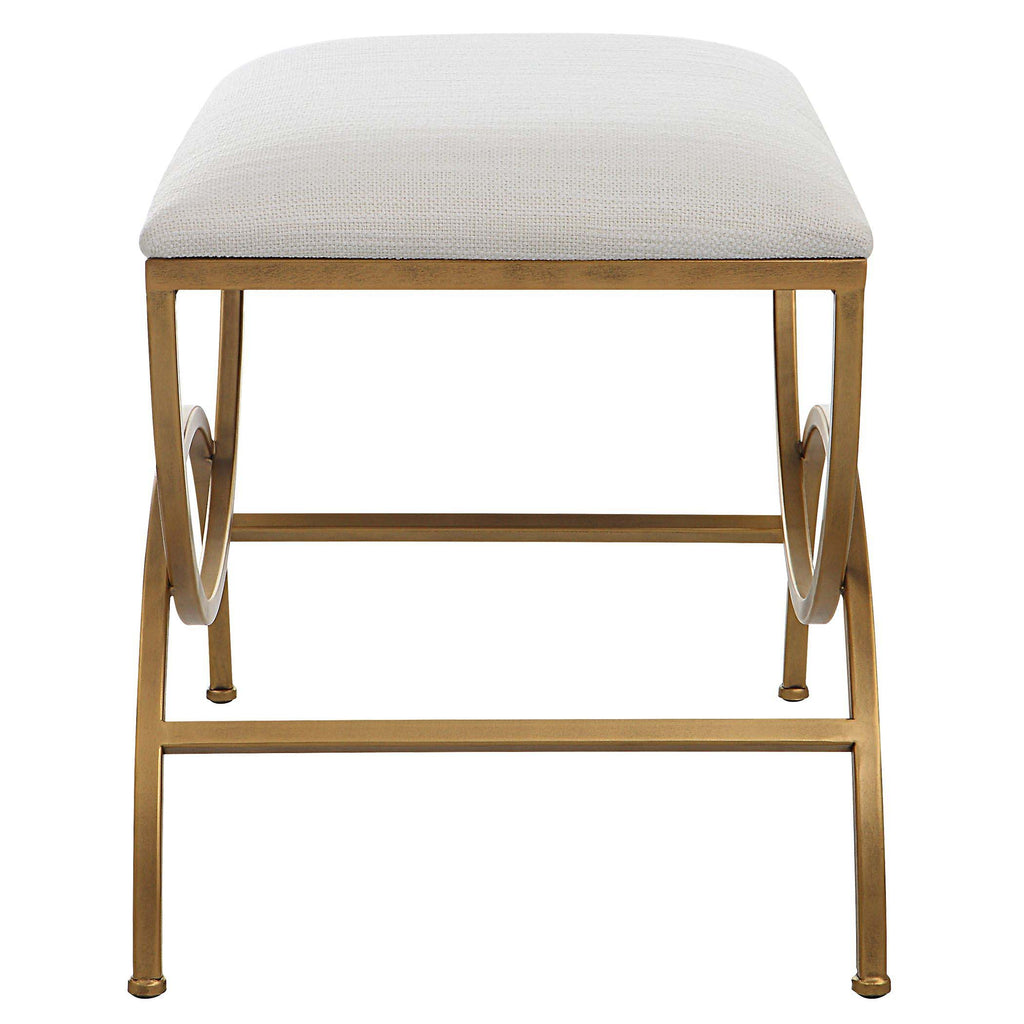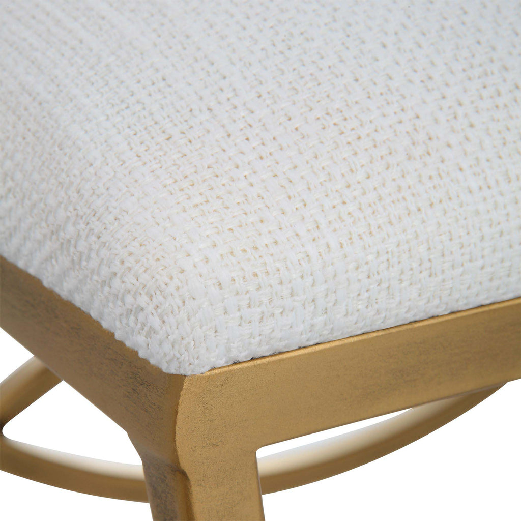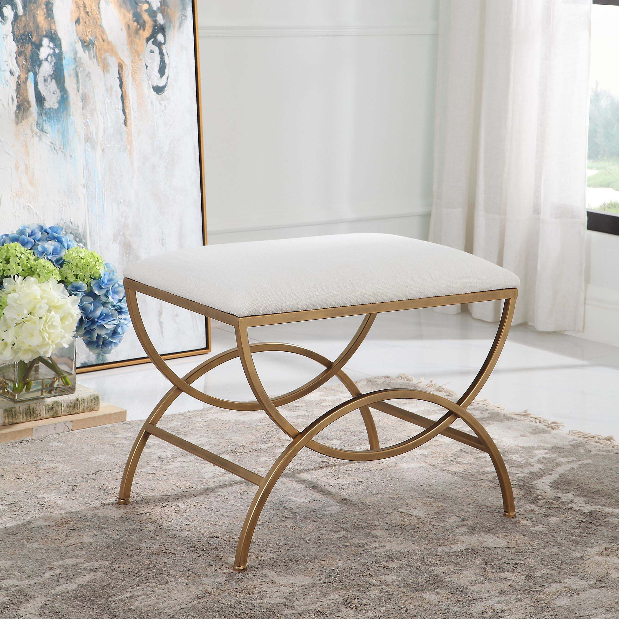 This elegant accent stool, featuring overlapping metal double arches, is finished in an antique brushed brass. The upholstered cushioned top is an off white, lightly textured fabric.