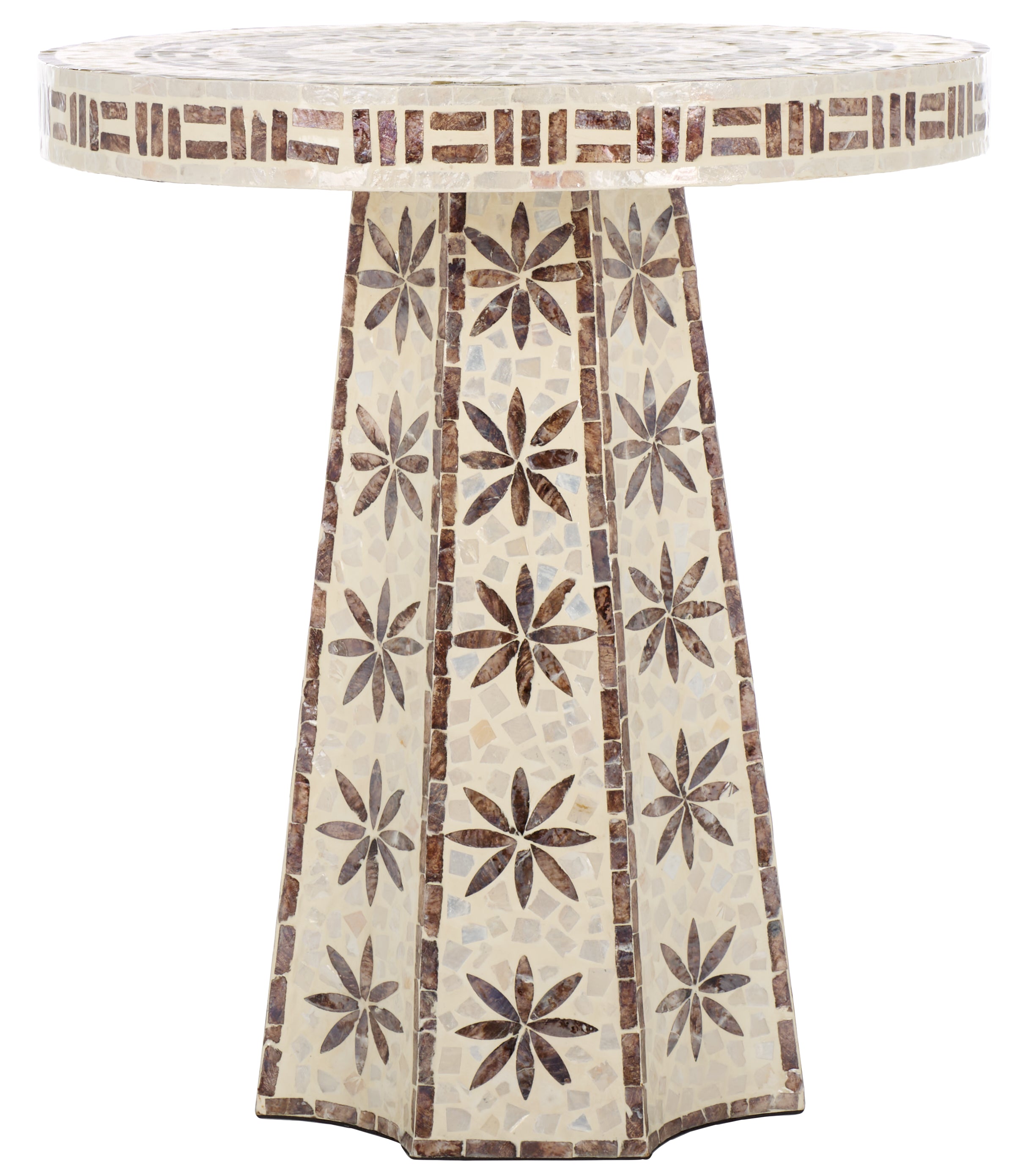 Beautify your home with the rich artistry and elegance of our Keerin accent table. Enriched with eye-catching patterns and a sculptural profile, our accent table creates a dramatic visual play. The strong geometry of its round tabletop is accentuated with a capiz inlay. A sculptural pedestal stylishly displays the elegant patterns and iridescent sheen of the capiz shell. Completed with a translucent white and gold finish, our accent table adds wonderful appeal to your living space or bedroom. It can create an elevated display of your beloved decor items or keep essentials within easy reach.