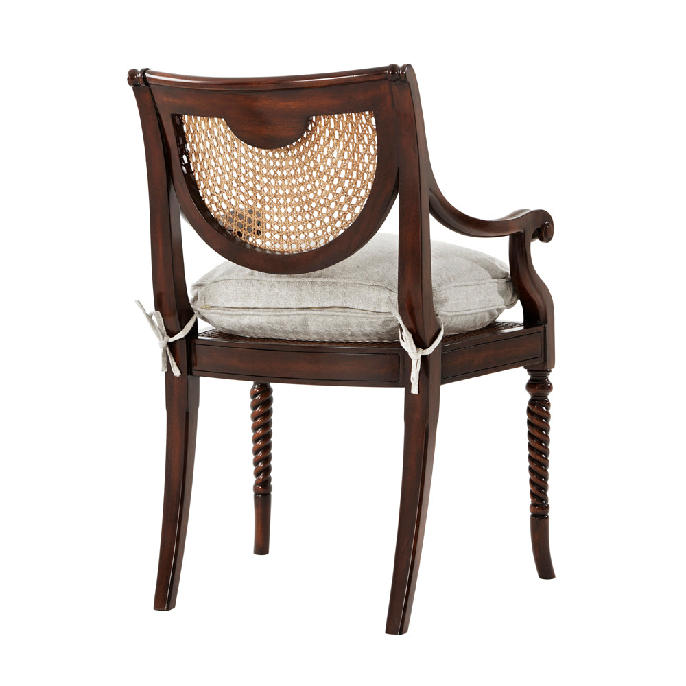 A hand carved armchair, the verdigris brass oval inset and caned back above a silk tie on cushion seat, on spiral turned legs. The original Regency.