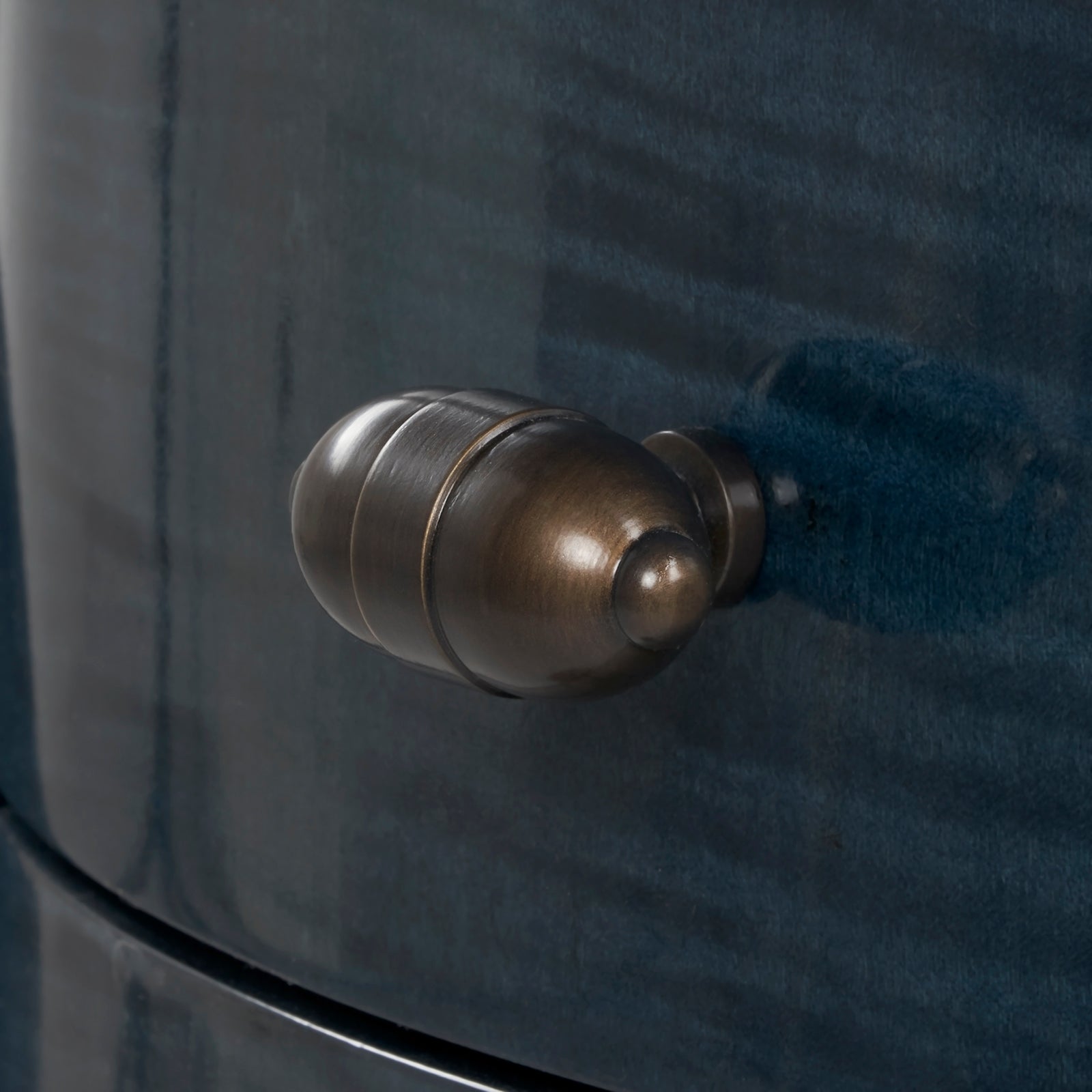 The Natalie Side Table pairs graceful curves and thoughtful storage. Its oval silhouette features two drawers and a lower shelf, ideal for stowing away essentials, with ample surface area for display. Crafted in striking anigre wood, the piece showcases a natural fiddleback grain that shimmers subtly in the light. Burnished bronze drawer pulls and sleek, tapered legs add polish and poise, giving this compact table a sense of lightness and quiet sophistication.