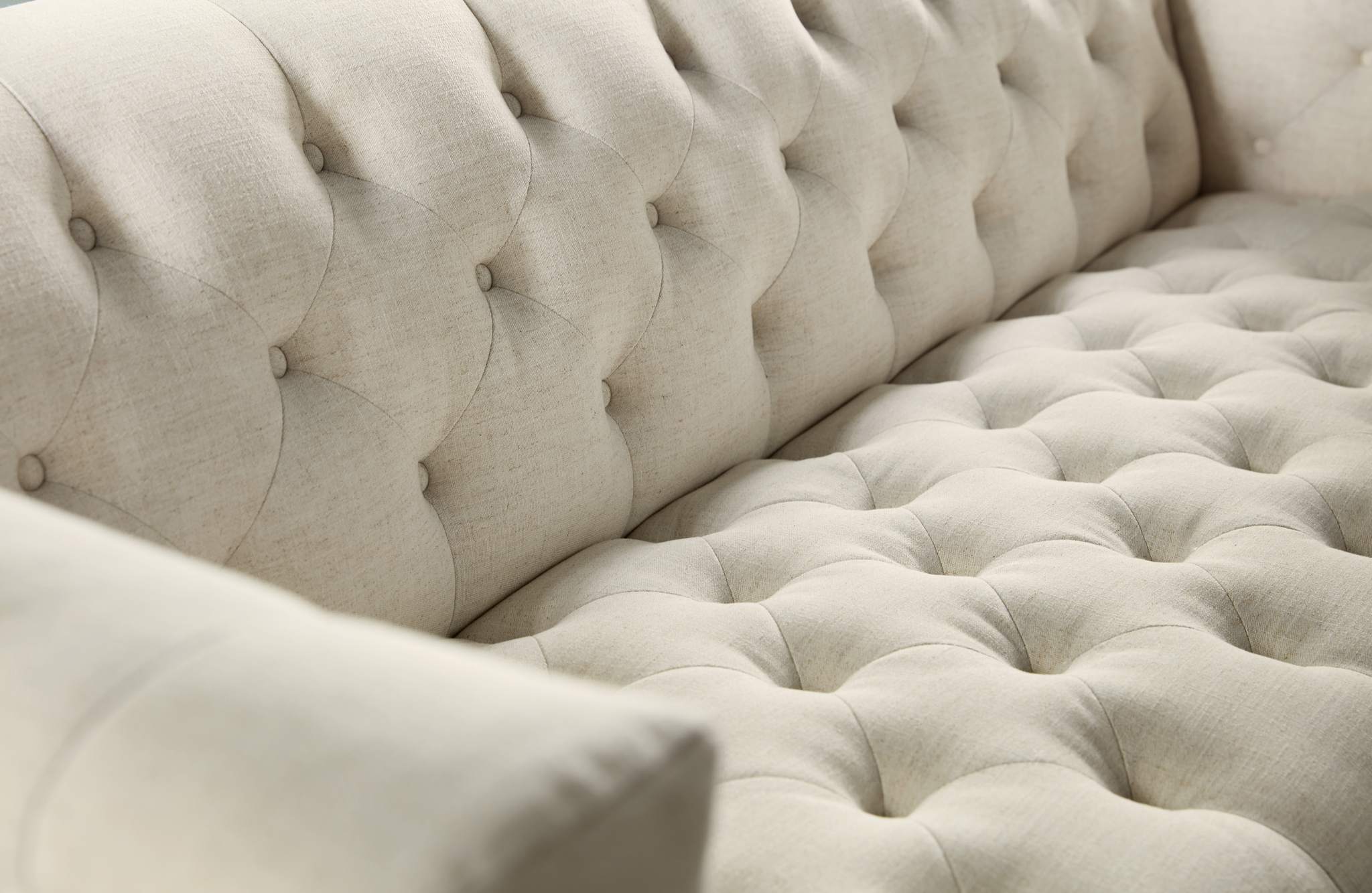 The Nicolla Stationary Sofa in Baldwin Natural performance fabric exudes modern traditional charm. Its chesterfield-inspired shelter arm design, combined with button tufted detailing, offers a blend of elegance and comfort. The heathered two-tone sand-colored flat weave fabric adds sophistication, while tall matte black metal tapered legs enhance its modern, airy appeal. Perfect for any living room, this sofa combines style and comfort seamlessly.
