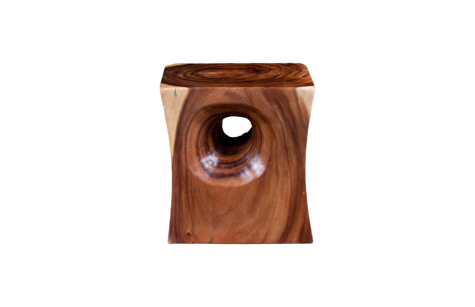 At Phillips Collection, we are highly selective in the wood we source. Chamcha is a fast-growing species of the Acacia family and is native to Thailand. We are drawn to the beautiful wood grains and blonde sap lines that create this two-toned natural finish. No need to change what Nature has already perfected! This playfully elegant side table is carved from solid wood with a decorative hole. We kept a freeform feel to the sides by not simply using straight cuts giving an organic feeling to this great piece.