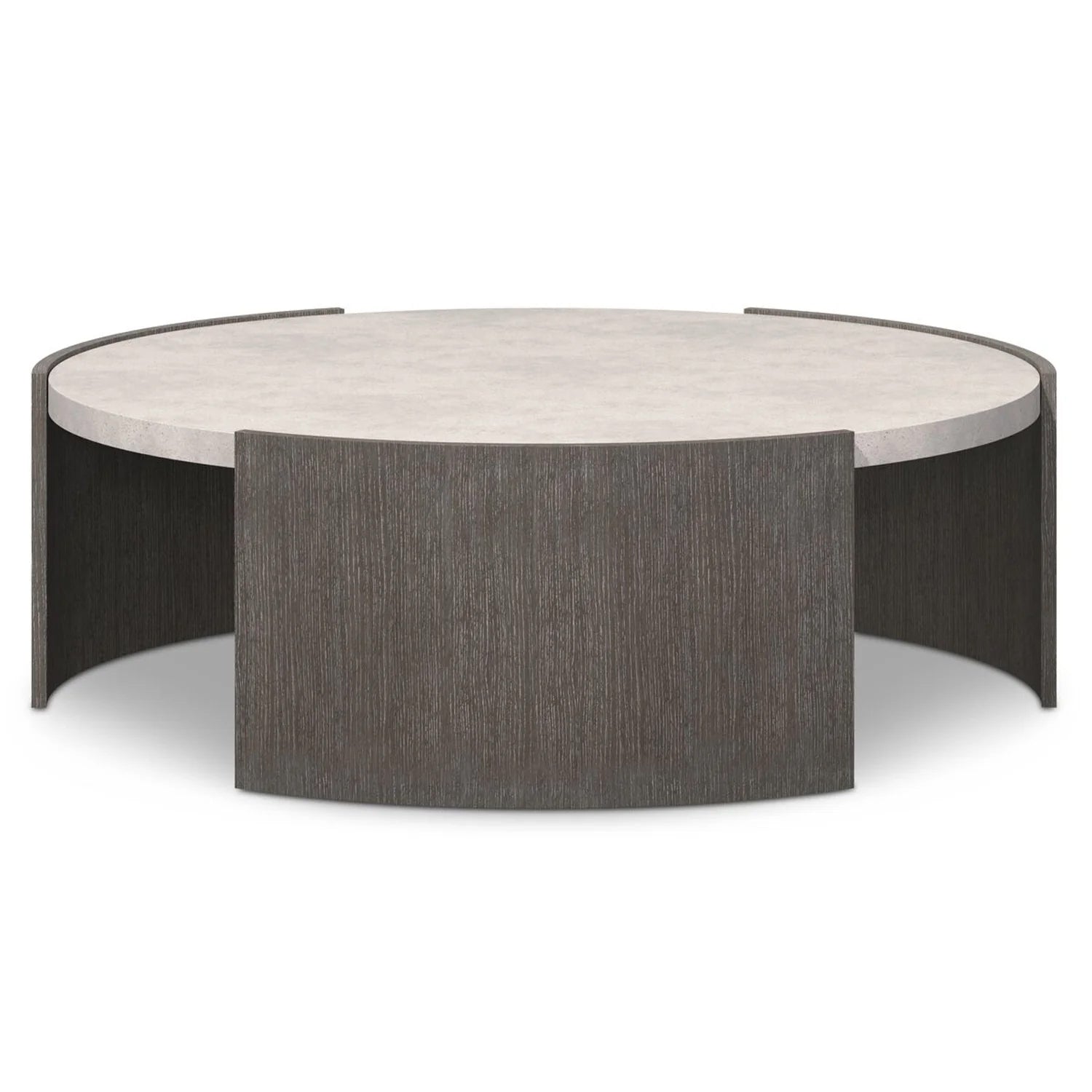 The Prado cocktail table offers a novel approach to modern rustic design. Three curved wood panels in a Porcini finish surround and support a round, cast glass-reinforced concrete top. Textural finishes and the balance of light and dark finishes craft a beautiful, contemporary style.