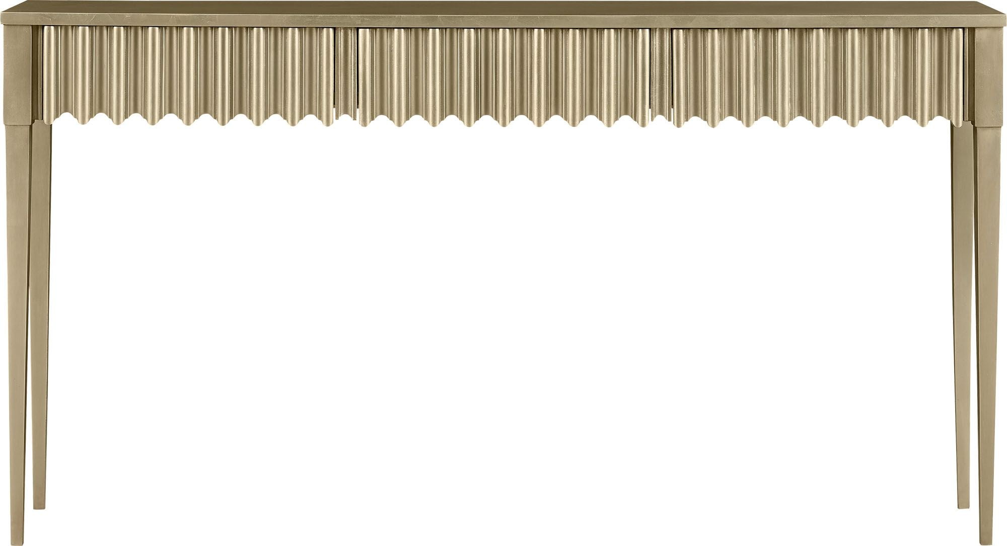 The Reese Console Table is contemporary and textural, defined by ruffles and ribbon detailing. It includes three hidden drawers beneath a surface of irregular white gold leafing.