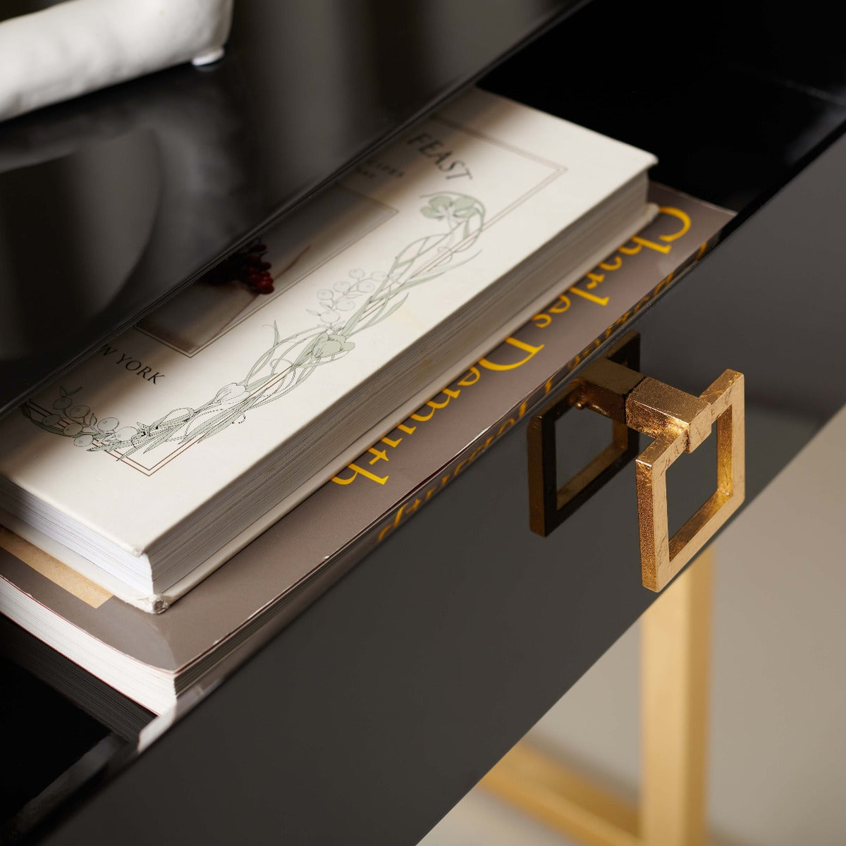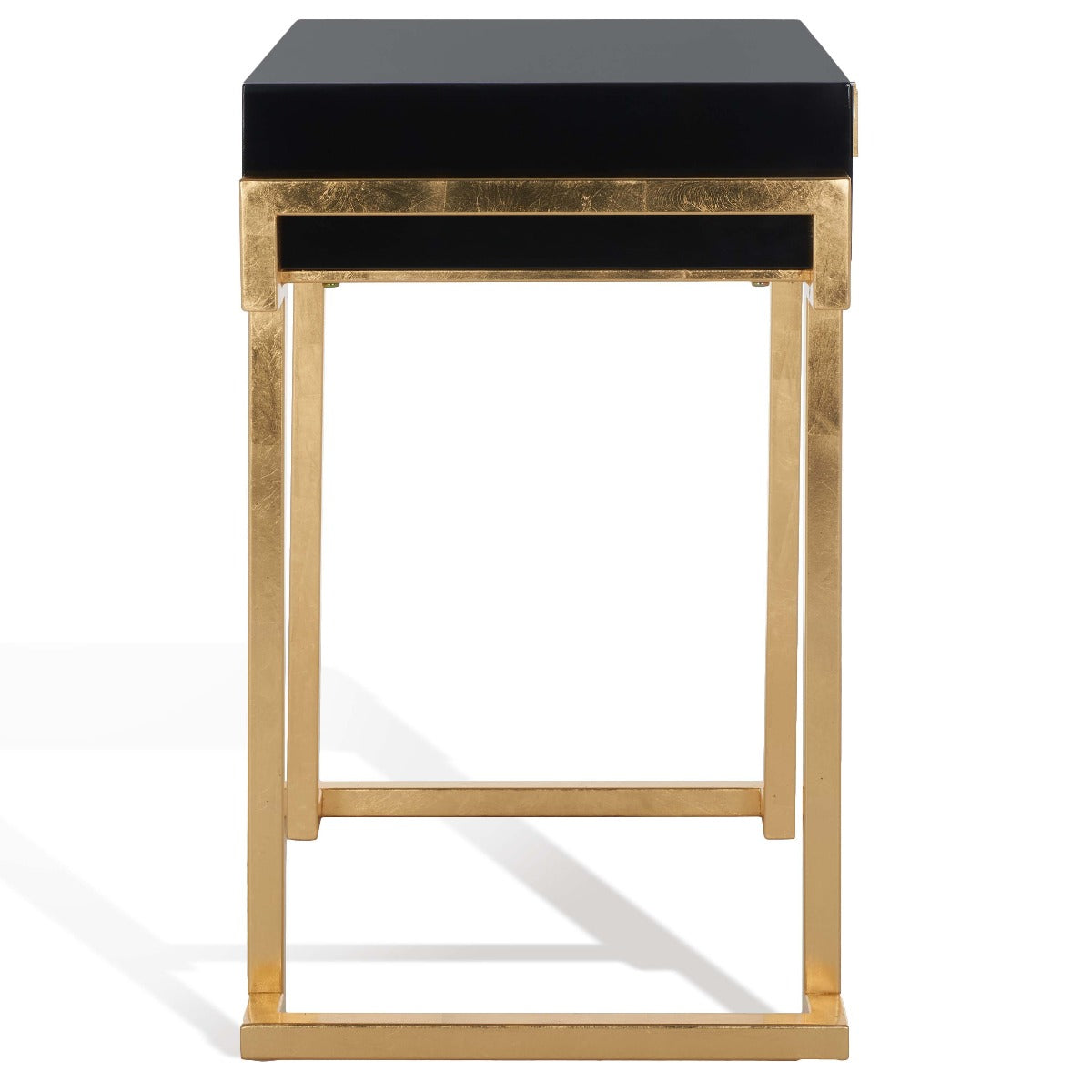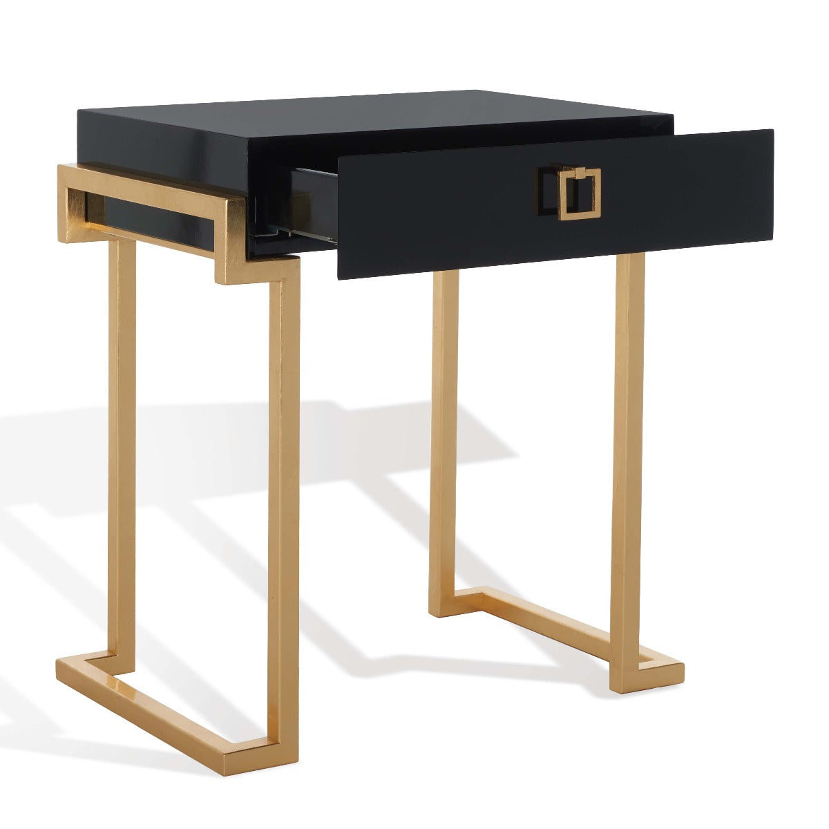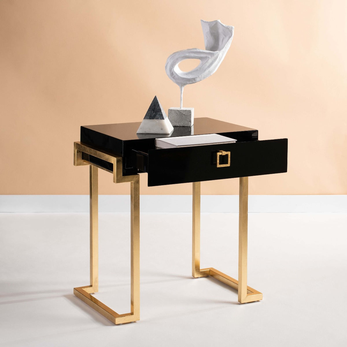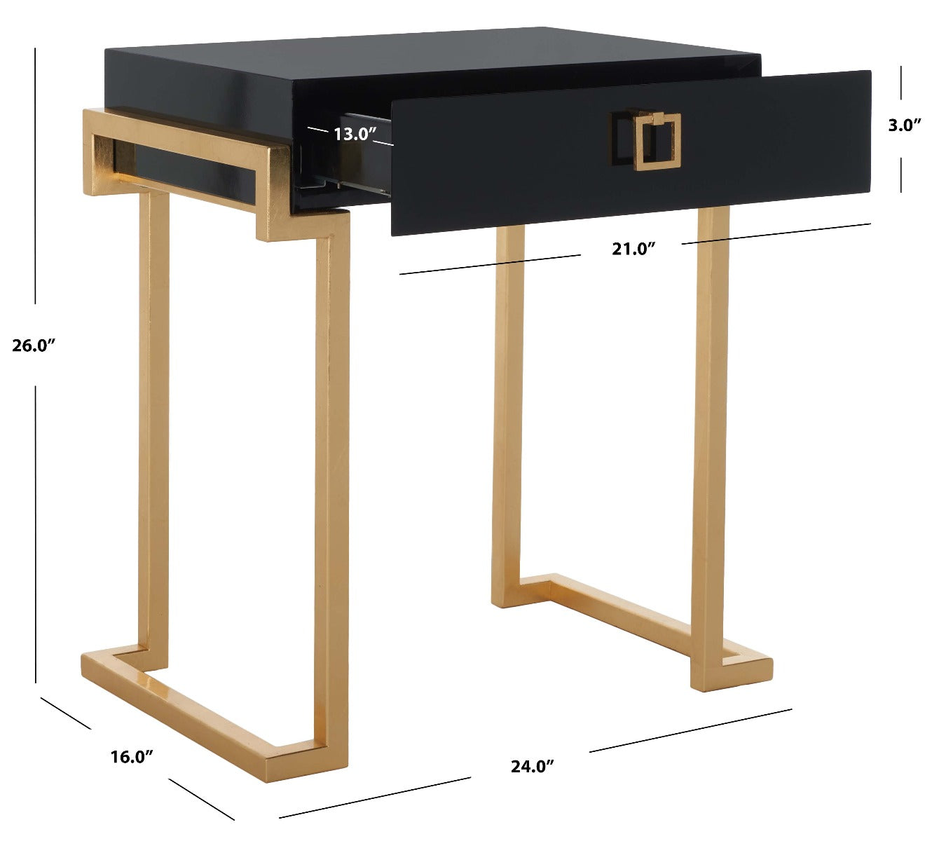 Embrace the new traditionalist style with this modern accent table. Its classic black hue shines with its sleek lacquer finish and svelte gold legs lend instant glamour to any interior. Its exquisitely detailed brass hardware makes it a modern heirloom.