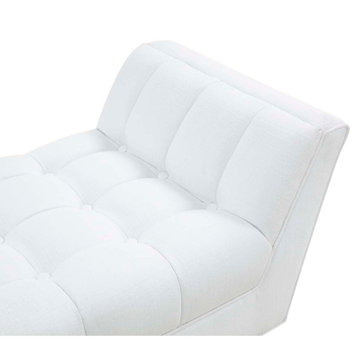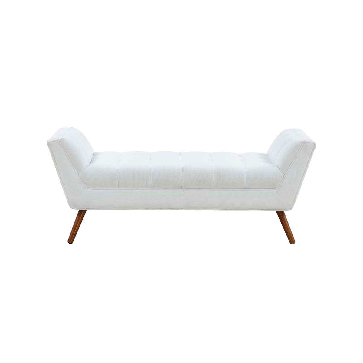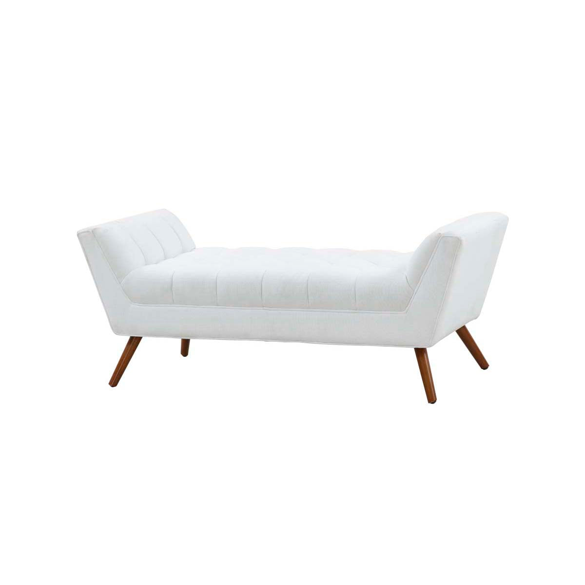 This Damian Bench translates Mid Century chic for todays contemporary interiors. The contrasting angles of Damians dark brown splayed legs and deluxe upholstered seat provide rich visual intrigue, while biscuit tufted white linen is ultra comfortable to the touch.