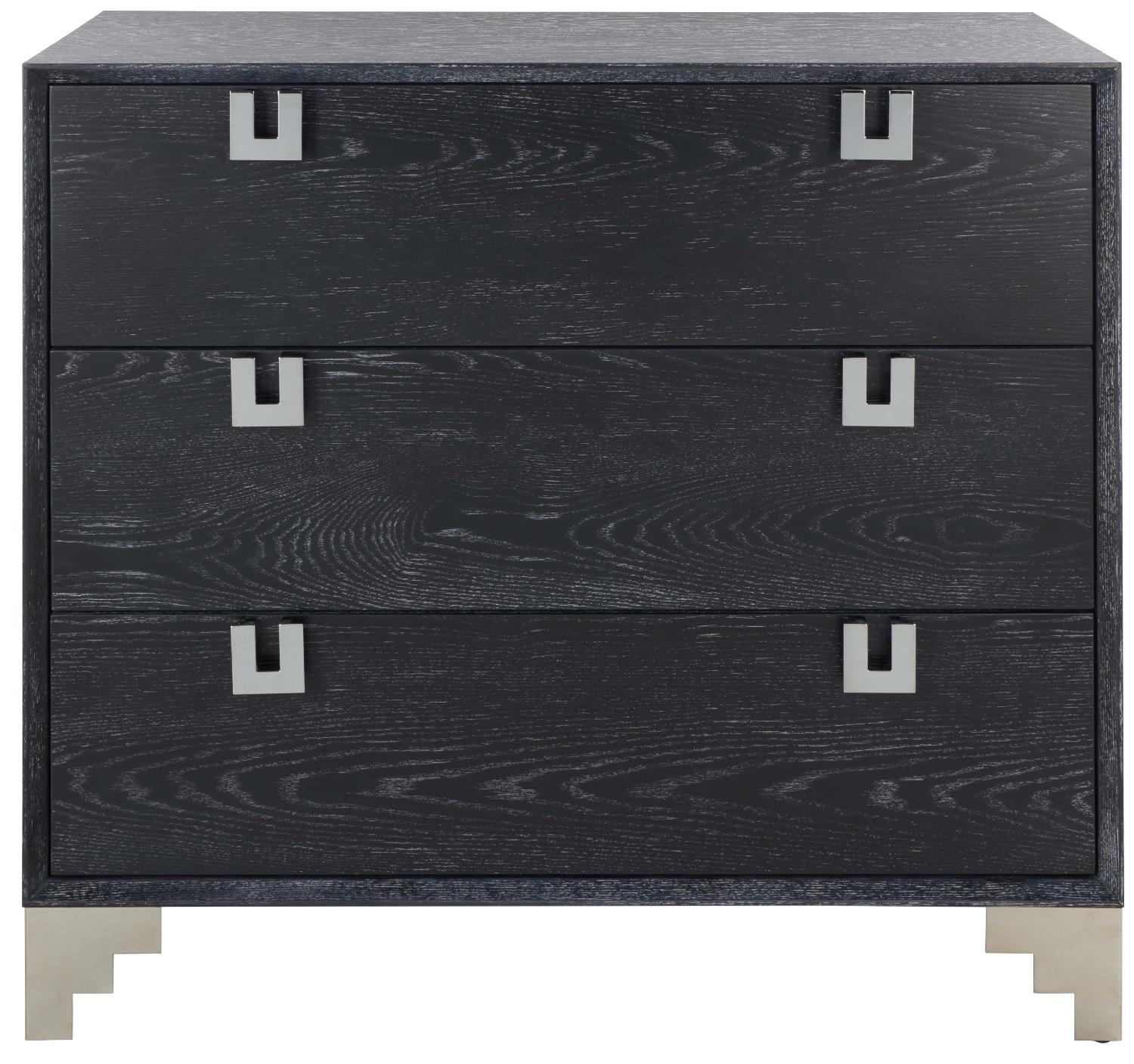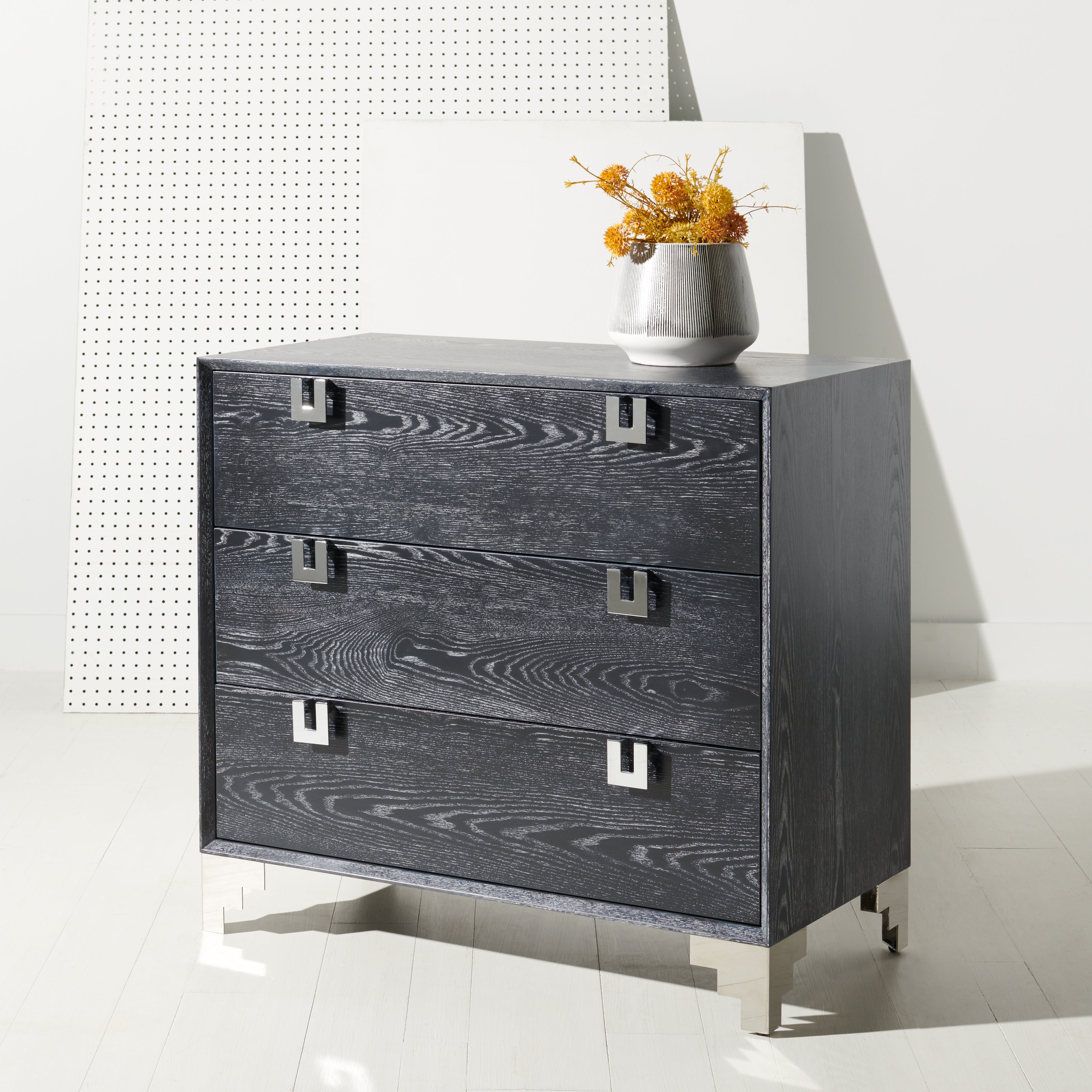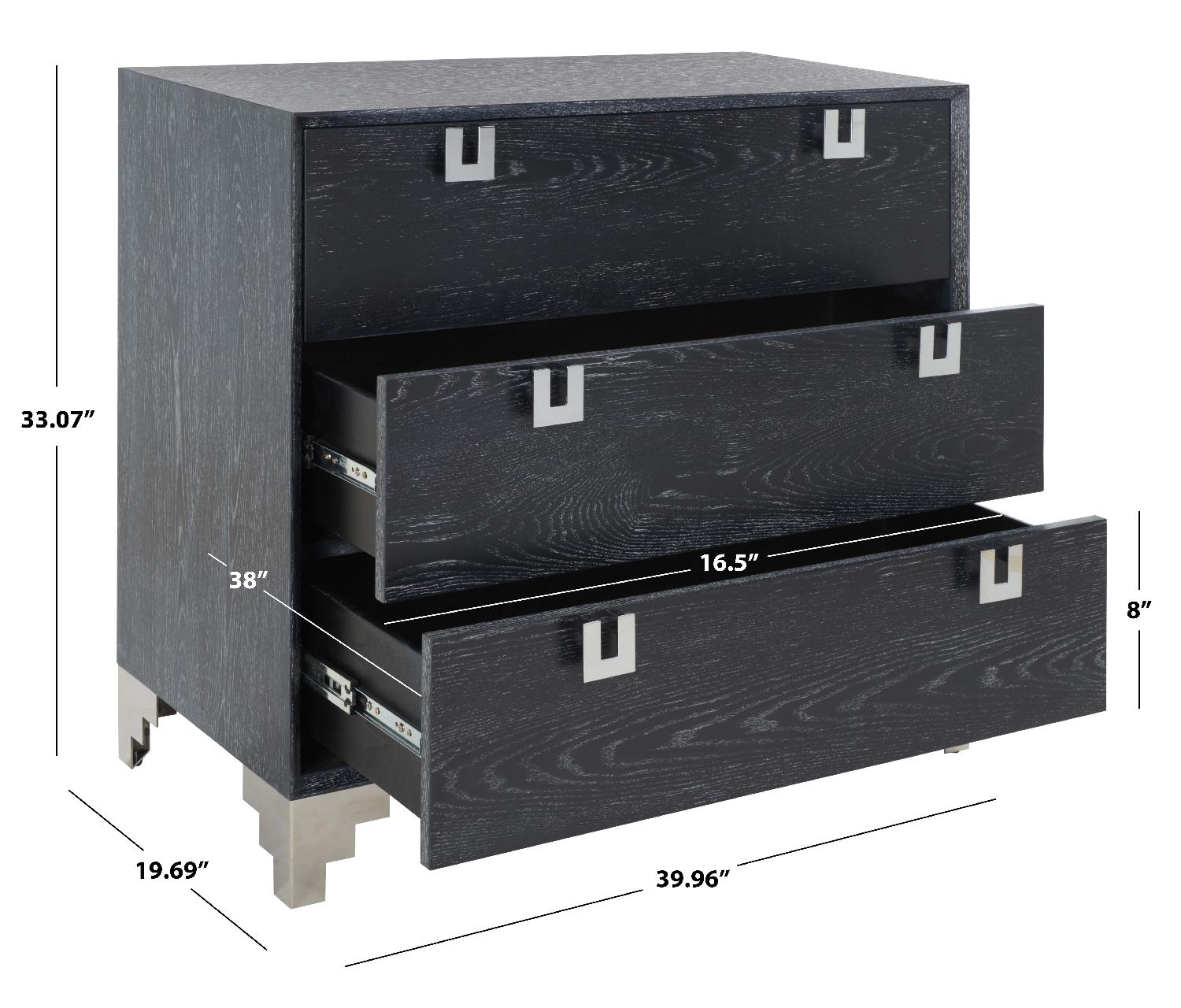 The Odalis Lacquer Chest of Drawers epitomizes the couture lifestyle with its black cerused oak finish, classic silver hardware and three generous drawers. It's perfect for extra blankets in a gracious living room or for storing outdoor accessories in the foyer.