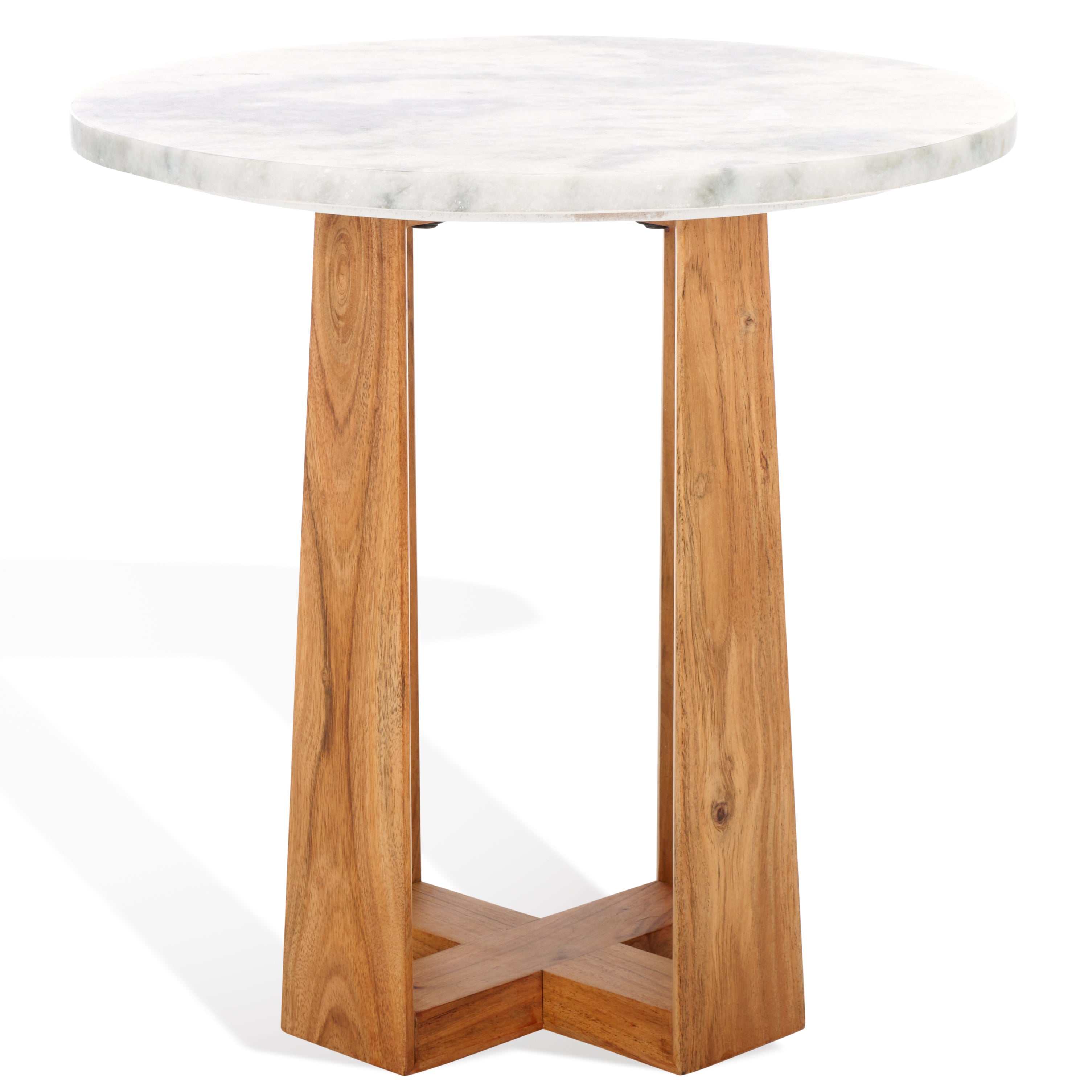 Update any corner with the modern charm and grace of our Trenton round accent table. Mixed-material elegance lends polished contrast and elegance to our streamlined accent table. The thick, tapered legs of the table gracefully intersect to attain an eye-catching presence. Its round tabletop showcases the natural veining of white marble. It is complemented with the rich tonal variation and organic textures of Acacia wood. Creating a beautiful harmony of textures, our accent table adds visual character and charm to your favorite sofa or armchair.