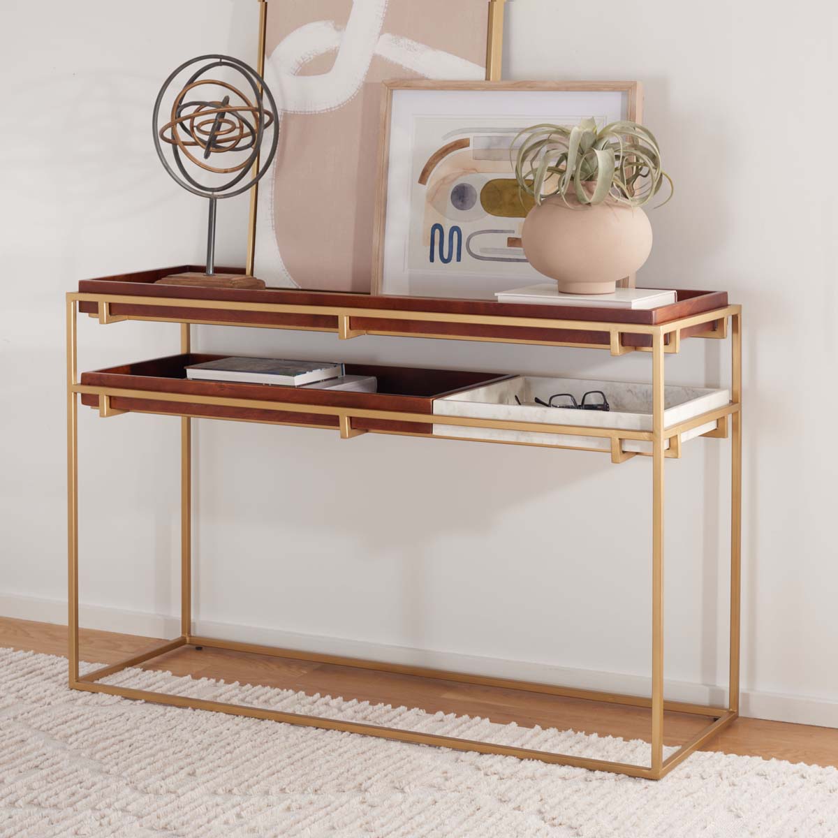 Enchant the entryway or living room with this absolutely astonishing Akari Console Table. Flaunting a fabulous pairing of glamorous white marble and deep brown wood for a lavish couturier feel, Akari?? luxurious look is finished with an airy gold frame for additional decorative intrigue. Designers love its removable tray-style surfaces.