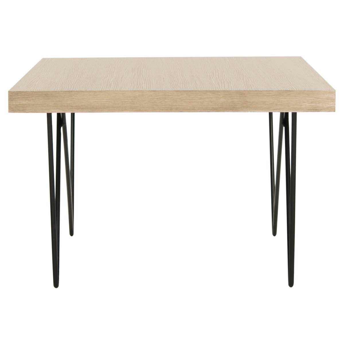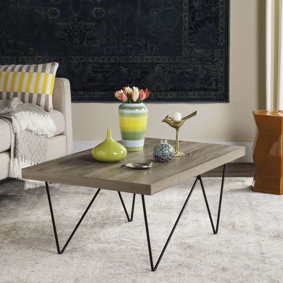 Inspired by a late French designer known for her spin on modern classics, this contemporary wood coffee table is an architectural marvel. Its elegant asymmetric style is perfectly achieved with the pairing of black iron hairpin legs and a light grey finish.