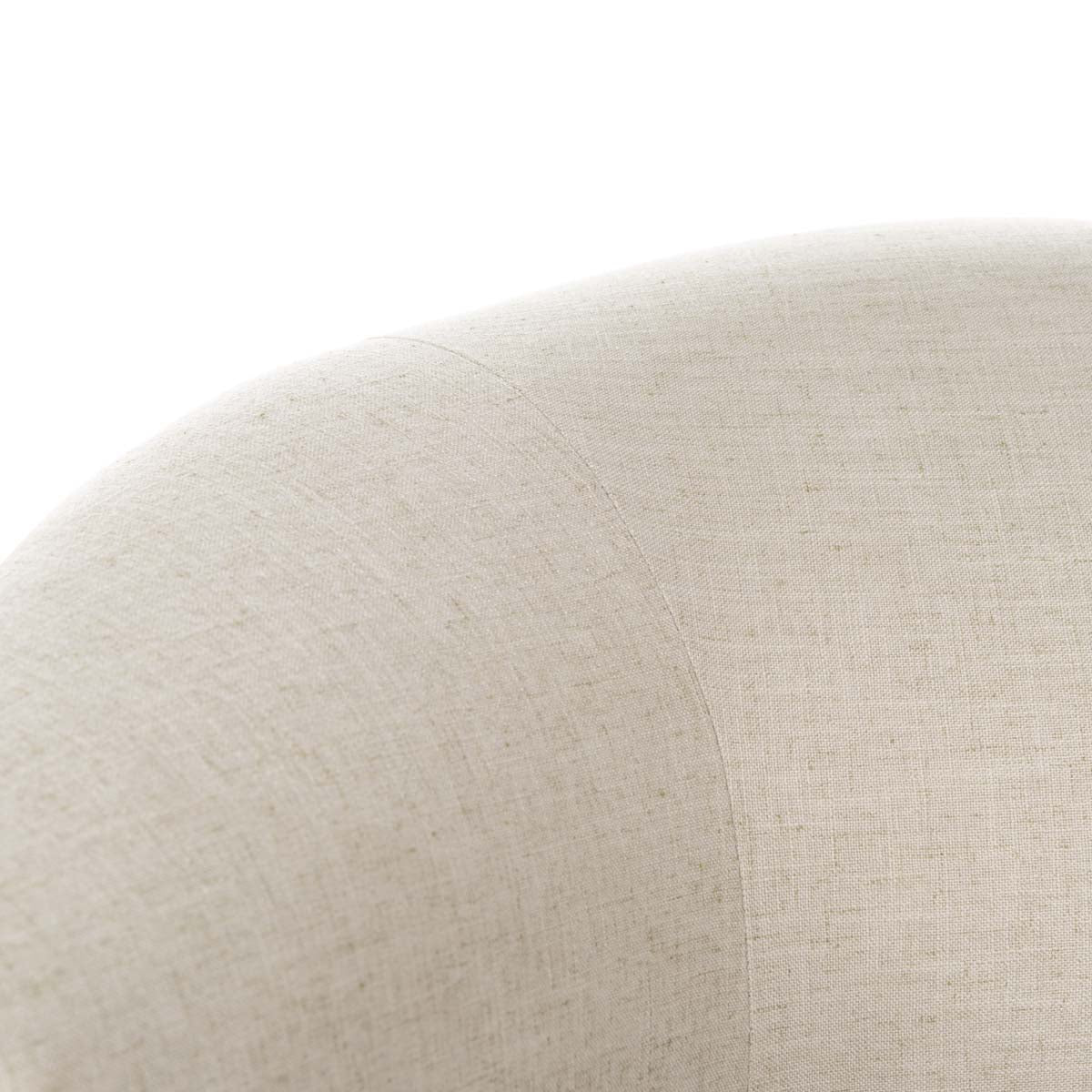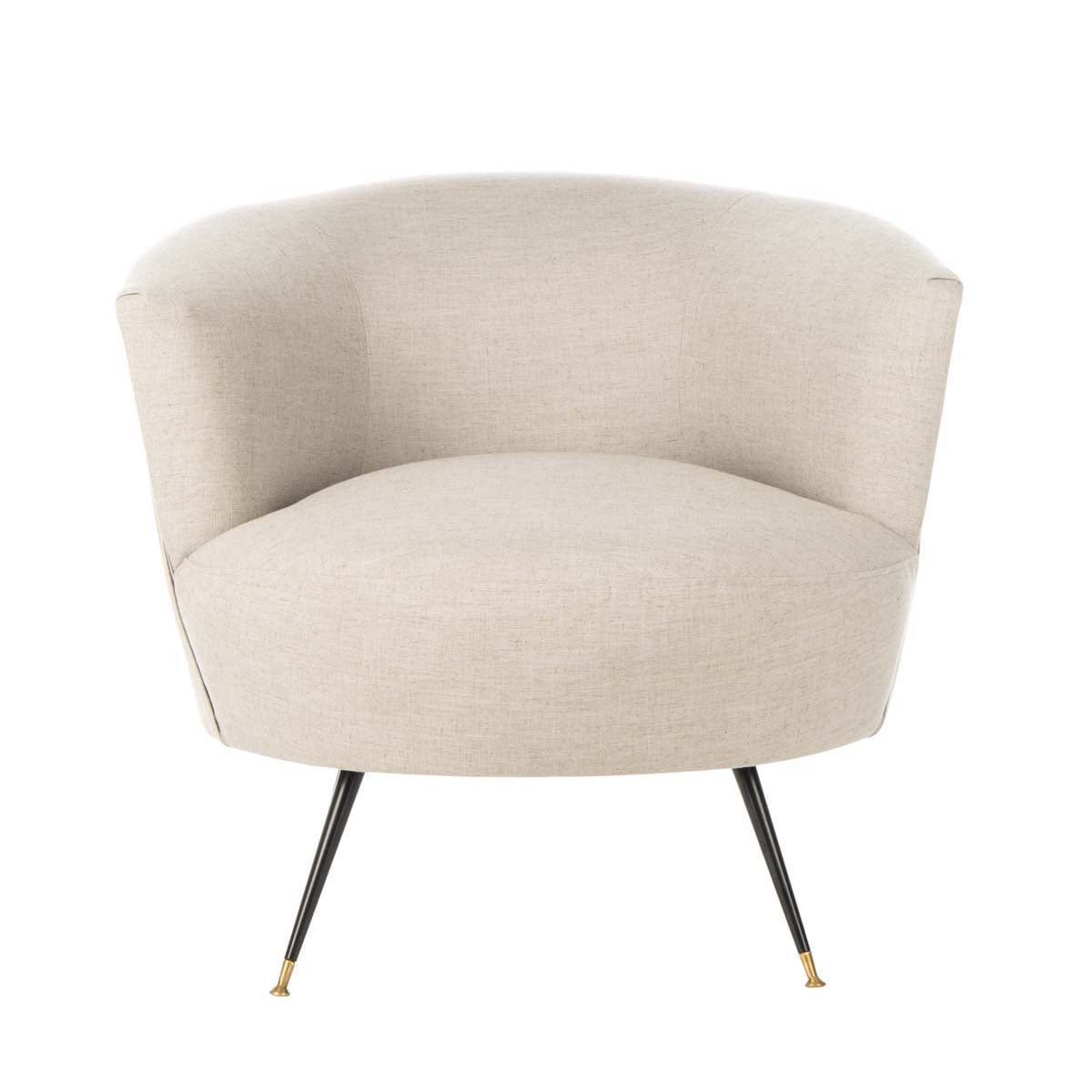 Updating the classic tub chair with a sleek silhouette, this Mid Century accent chair brings a luxuriant touch to any room. Upholstered in plush light grey linen, its stylish curves and chic gold cap legs make an instant statement.