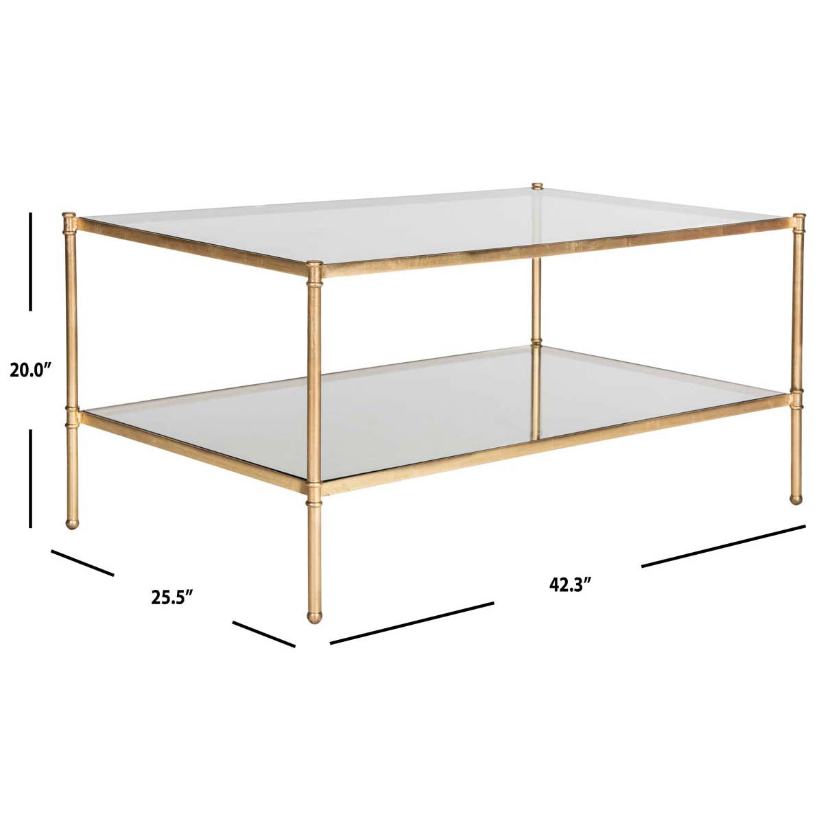 A refined design that embraces both classic and transitional styling, this two tiered Aslan Coffee Table provides ample space for collectibles, drinks, and hors d??euvres. Crafted of glass and iron with antique gold leaf finish for elegant interiors.
