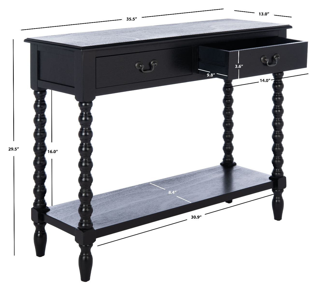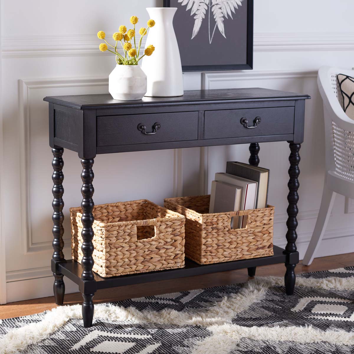 Bring farmhouse charm to any classic contemporary d?cor with this Athena Console Table. Athena?? modernized ball turned legs are beautifully highlighted by its sleek black finish, while an open bottom shelf and twin slim drawers provide ample storage and display space.