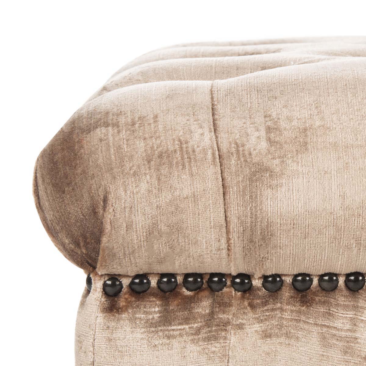 A touch of luxury at the foot of a bed or topped with a tray for use as a living room table, the Barney Bench by Safavieh is the epitome of transitional style. Mink brown velvet upholstery is softly button tufted for plush comfort, and brass nail head trim gives a rich designer look. Beautifully turned pickled oak legs are on casters for mobility anywhere you need an extra perch.