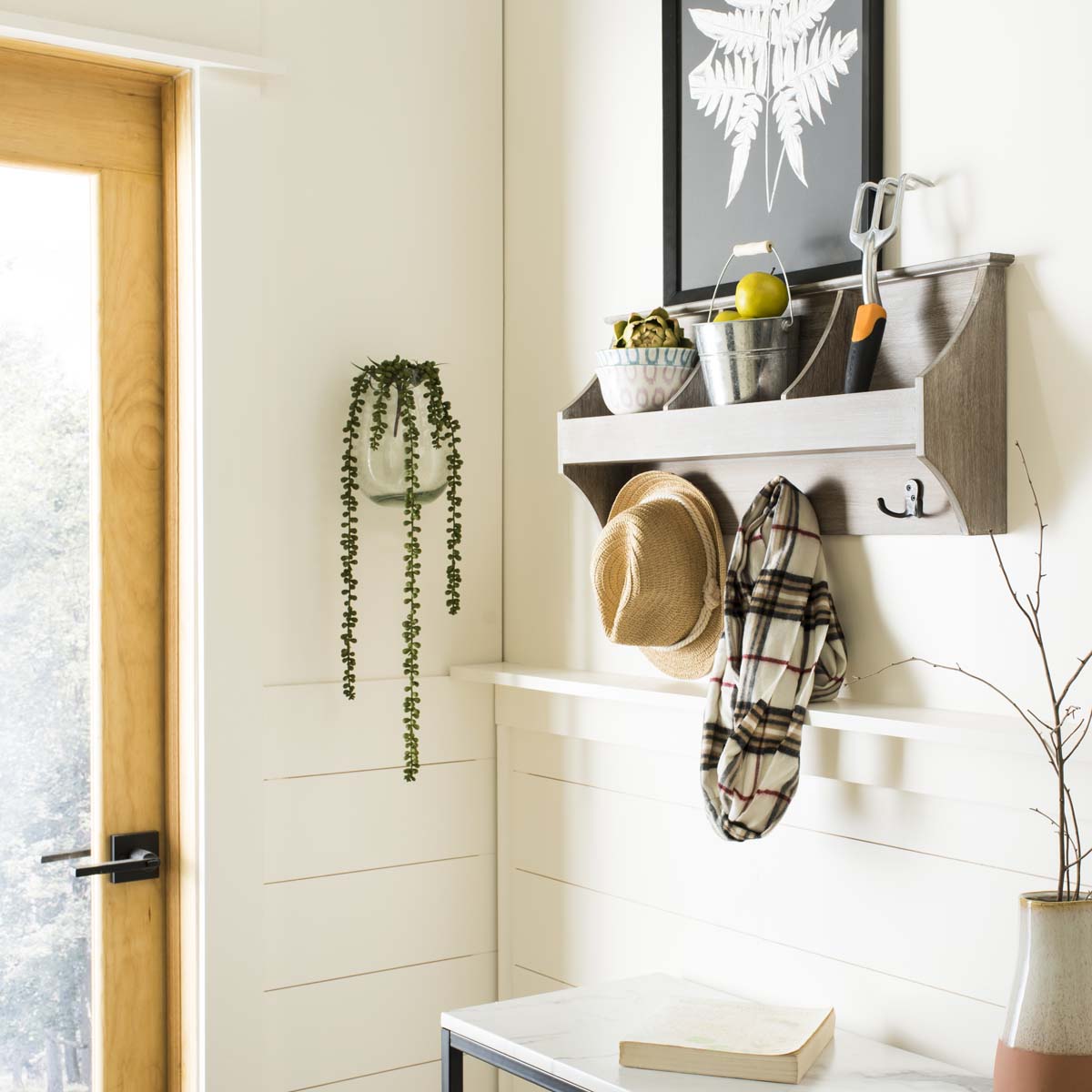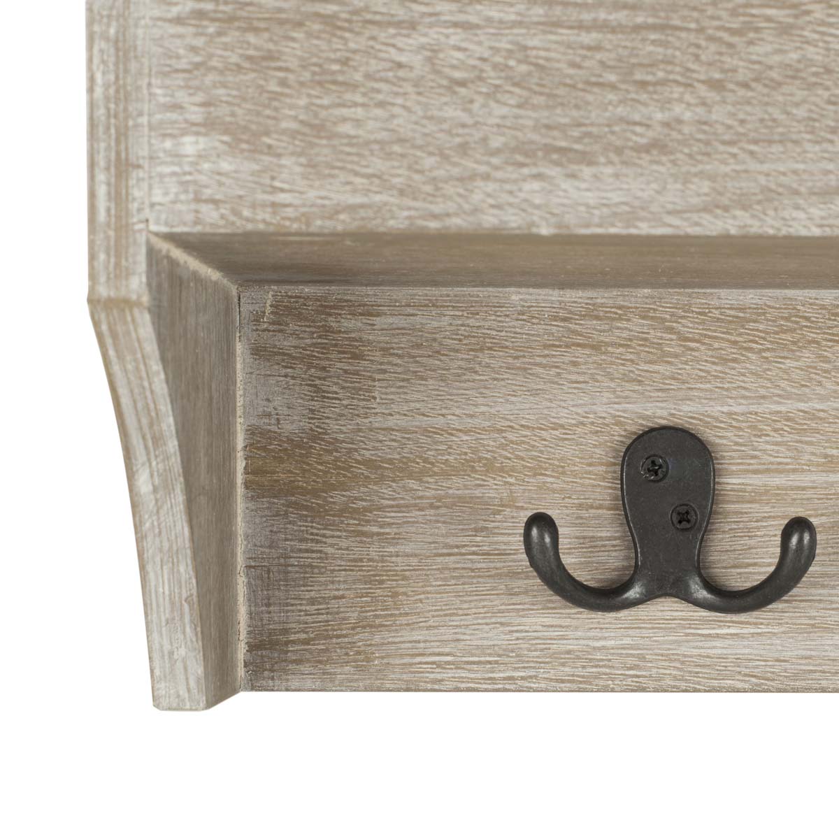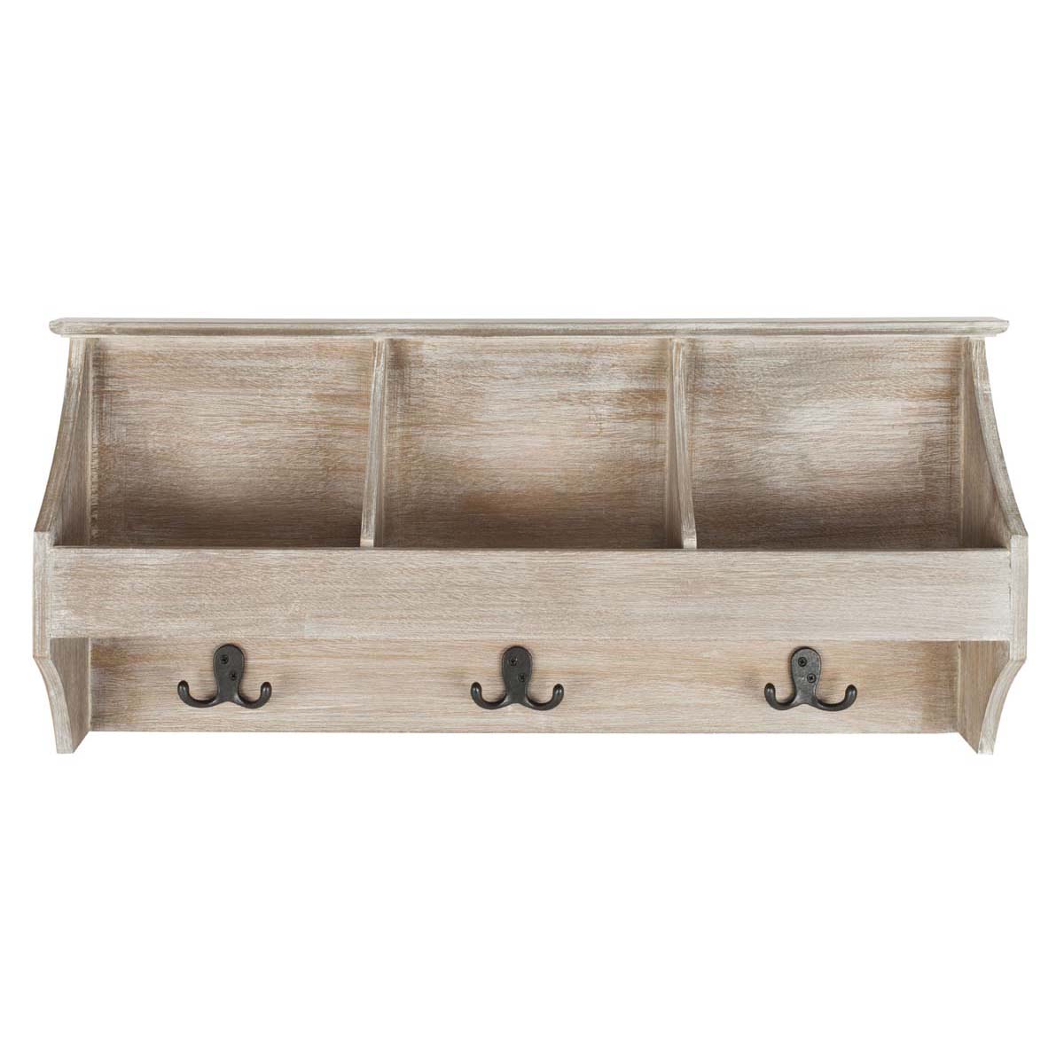 Poised and polished, this deluxe grey wood hanging storage wall rack was designed with the craftsmanship of fine furnishings. Its solid construction features three generous compartments and matching double hooks. Designers use it to make any entry grand.