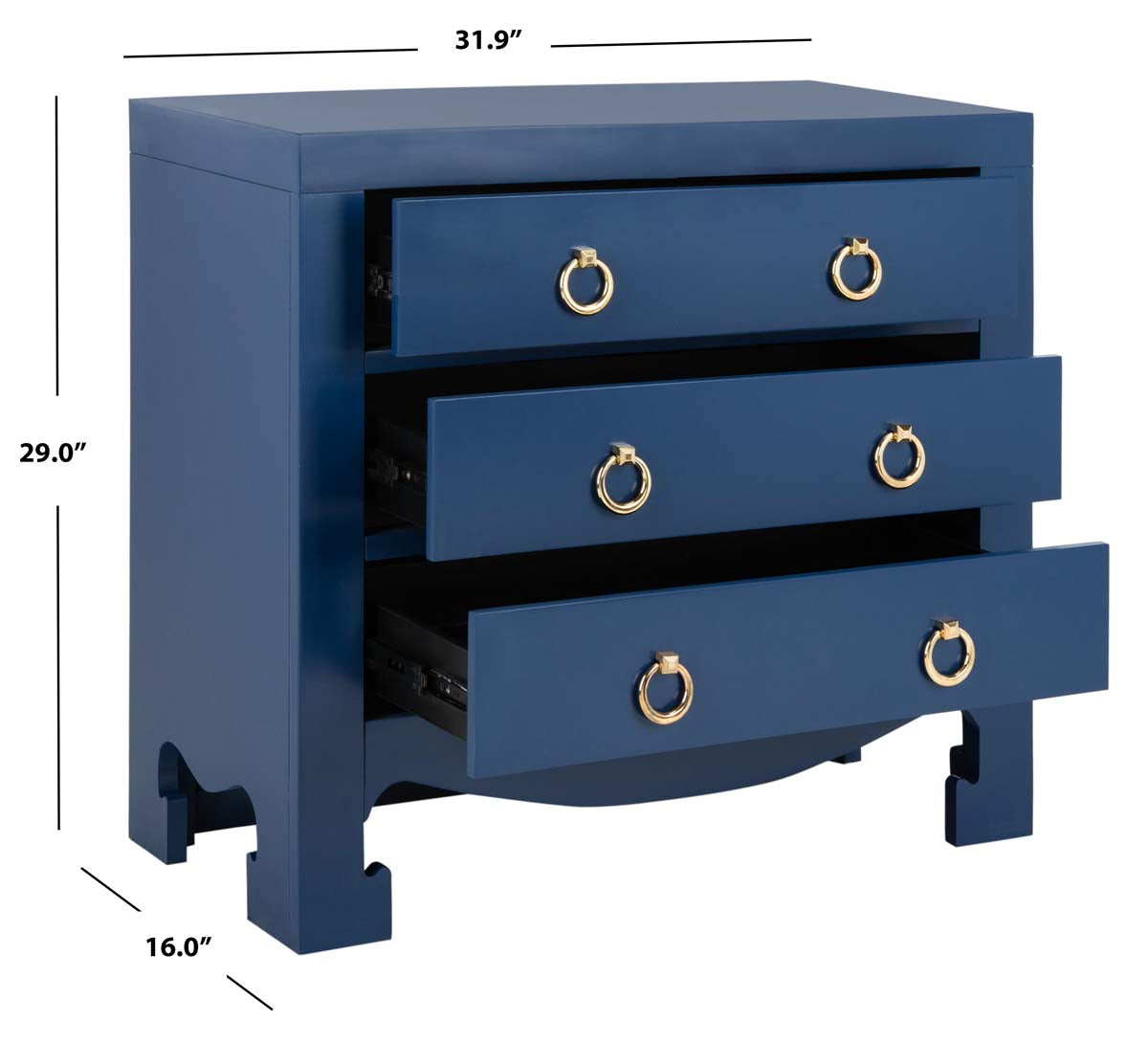 Ancient Asian sophistication is given a sleek modern update in this fabulous Dion Chest. Effortlessly emanating glamorous charisma, Dion's lapis blue finish highlights the shimmering gold pulls on its three drawers and Paifang inspired apron.