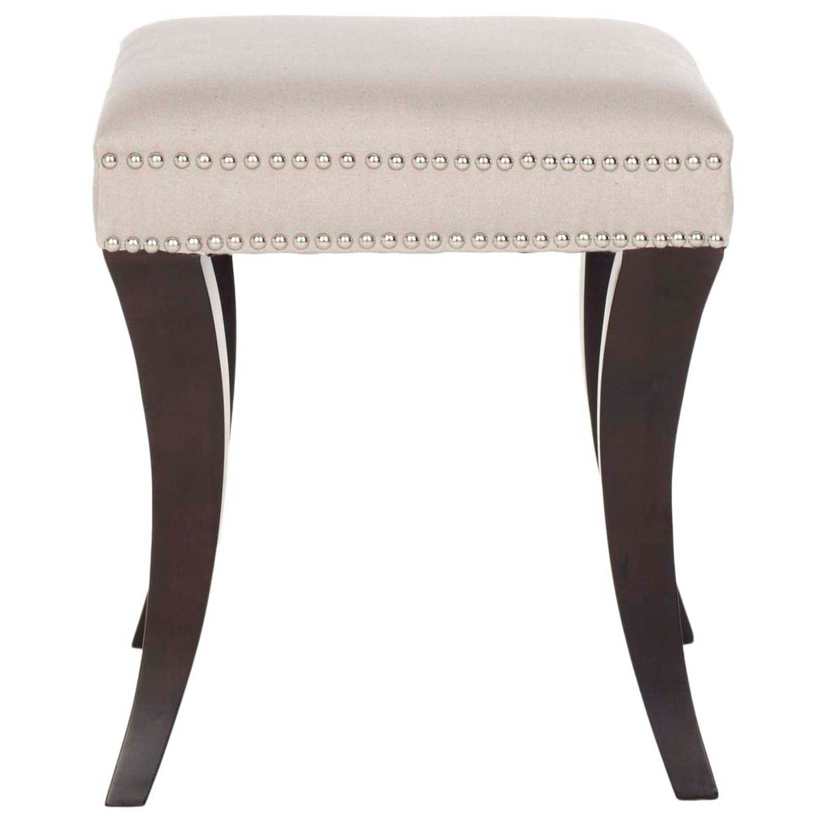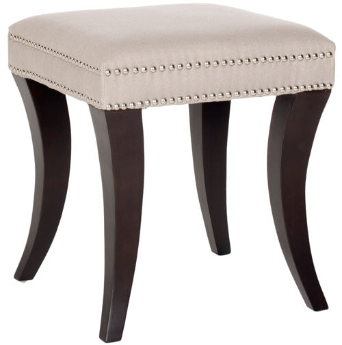 Brimming with designer details, the Diva ottoman?? whimsical animal horn shaped birch wood legs are finished in espresso to contrast taupe linen upholstery artfully studded with nail heads.