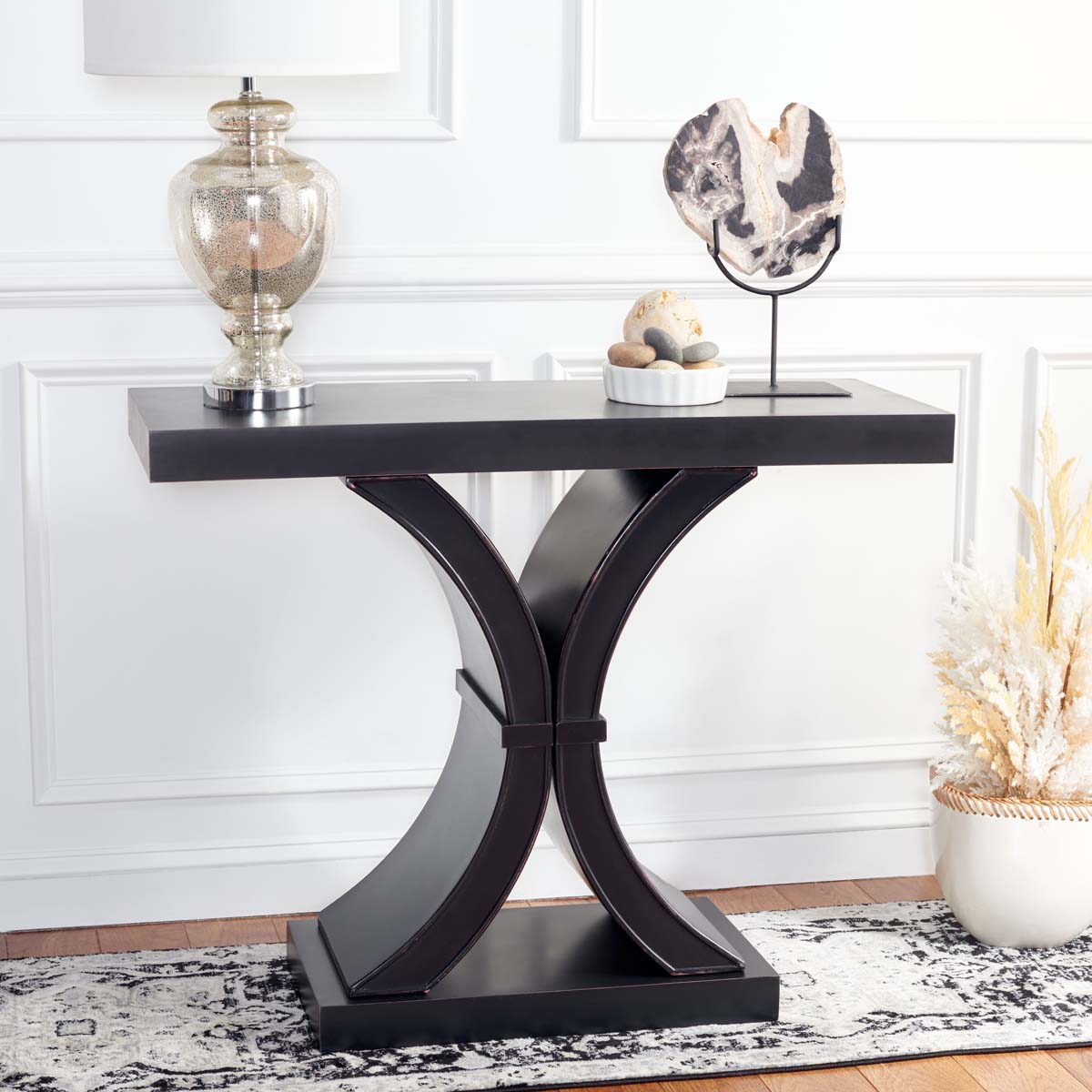 Classic and architectural, this Dryden Console makes a grand statement in an entry hall, behind a sofa, or gracing a living room wall. Dryden's traditional inspirations are given a modern update in a black finish, perfectly accent any room's color scheme.