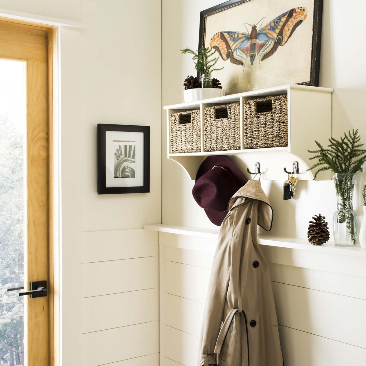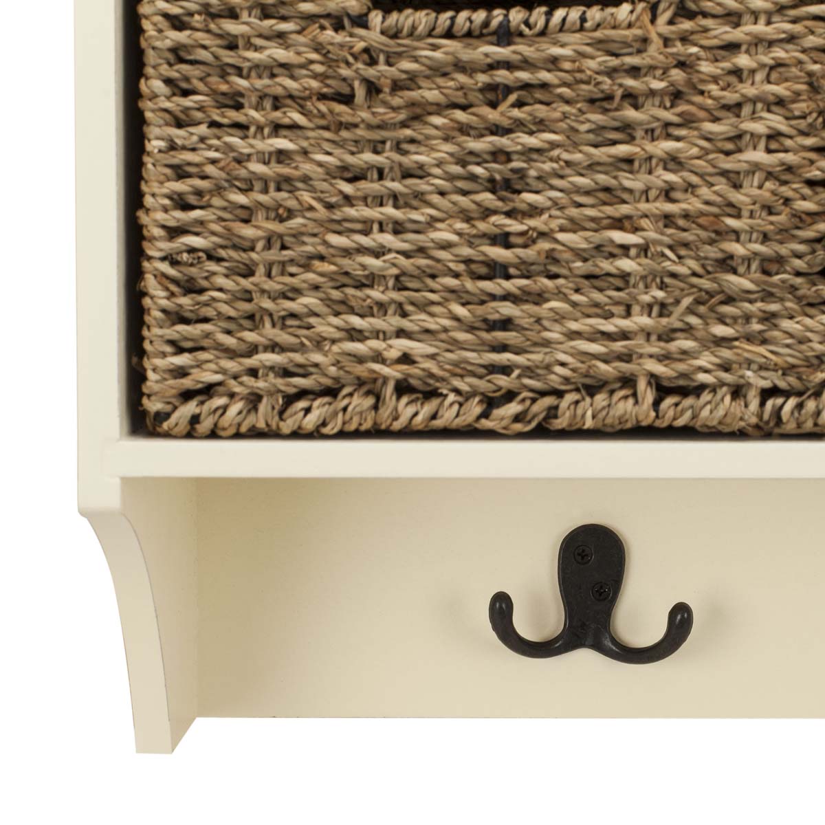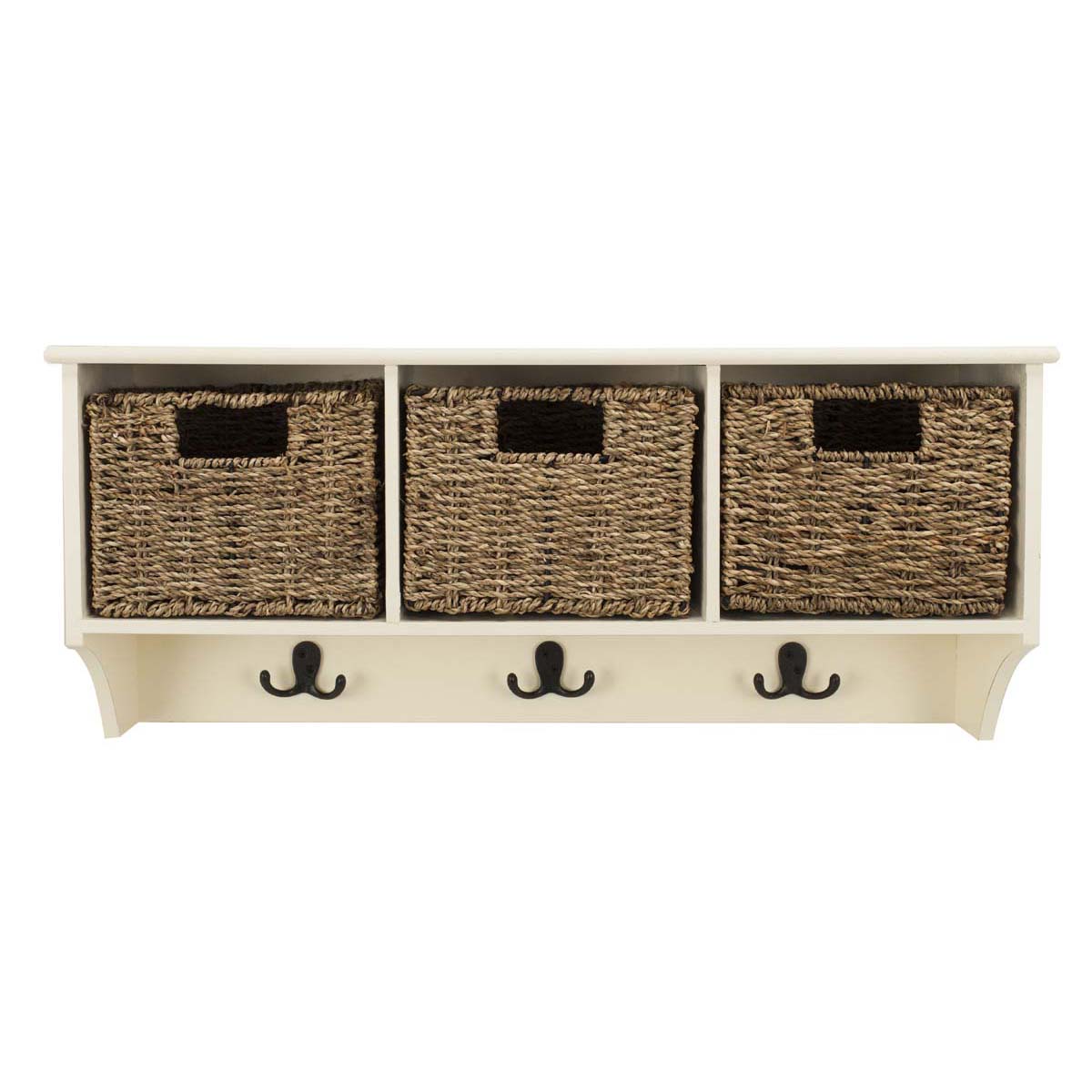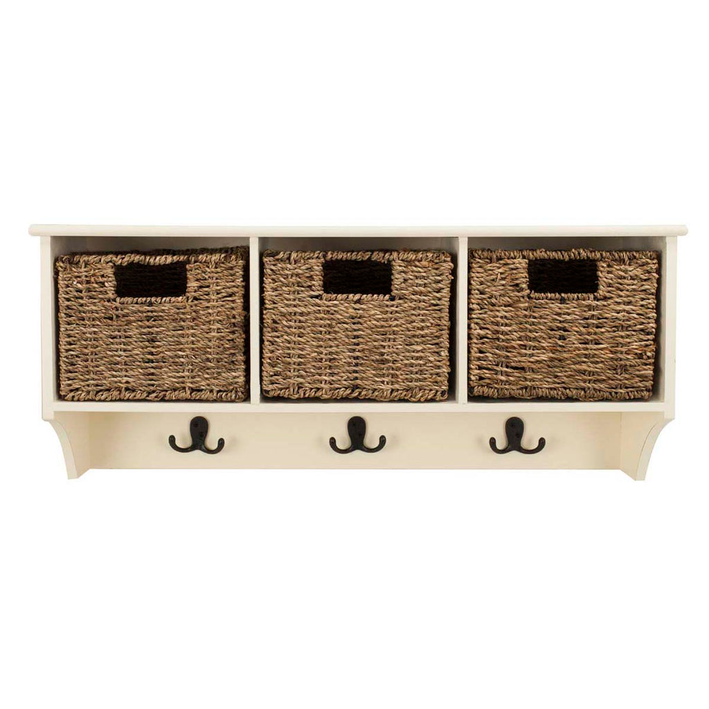 Add instant storage without sacrificing floor space with this white hanging 3 basket wall rack. The perfect storage companion, its removable baskets and double hooks offer generous space and blend into any d?cor. Ideal for any kitchen, bath or entryway.