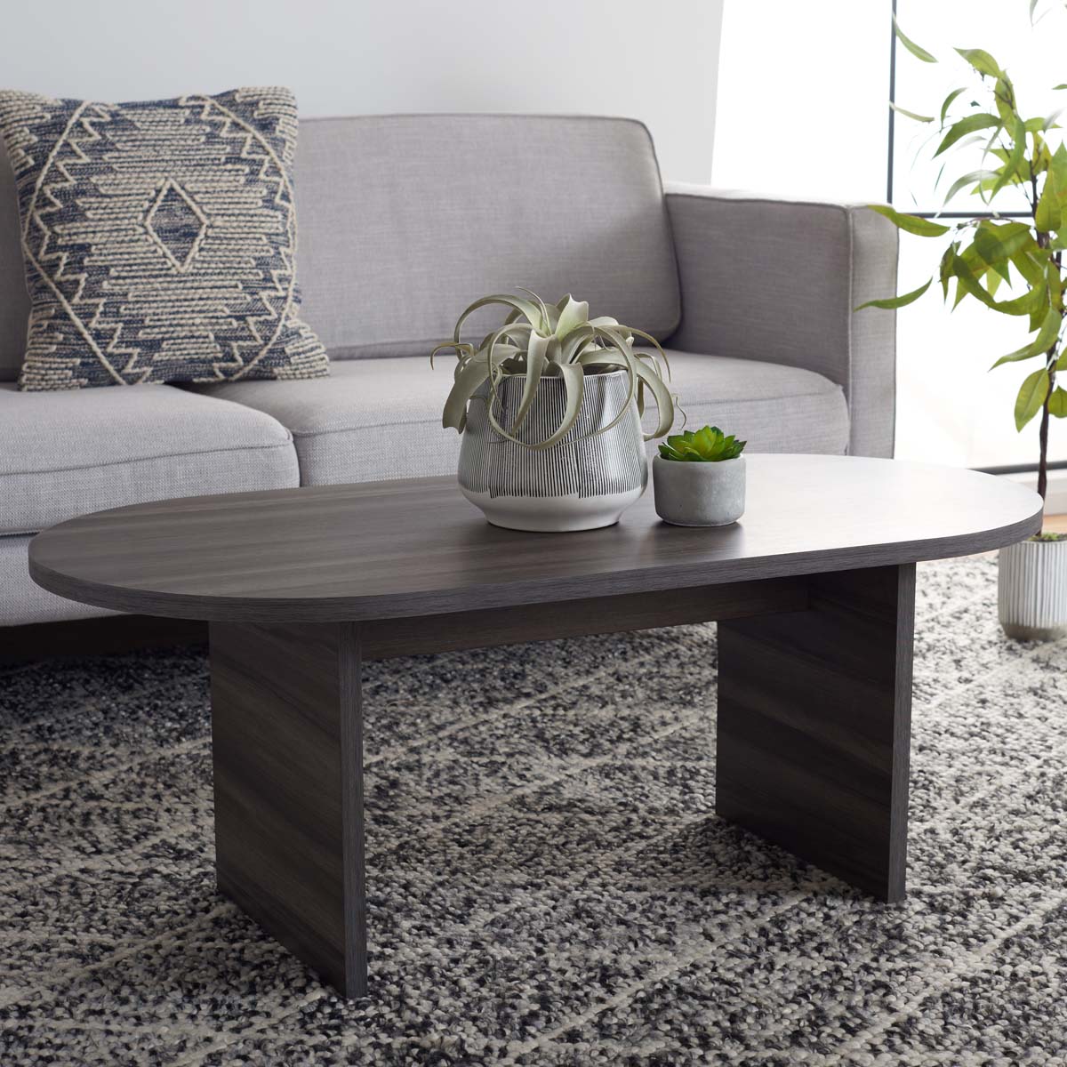 Enliven Your Home With The Effortless Charm Of Our Gareth Coffee Table. With A Streamlined And Modern Profile, Our Coffee Table Grabs Attention With A Finely Sculpted Capsule-Shaped Top. It Is Supported On Minimal Rectangular Legs To Open Up Your Space. Our Coffee Table Exudes Elegance And Warmth With The Lively Grains Of Wood In A Sleek Black Finish. Providing Ample Space To Display Your Favorite Accessories, Our Versatile Coffee Table Remains A Welcoming Addition To Any Room.