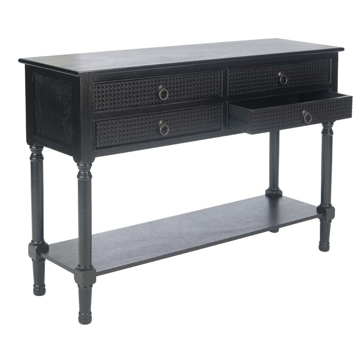 Redefining traditional elegance for today?? d?cor, this Haines Console Table brims with ageless style. Haines refreshes timeless carved details with a sleek black finish and four subtly textured drawers, making it ideal in any classic contemporary hall or entryway.